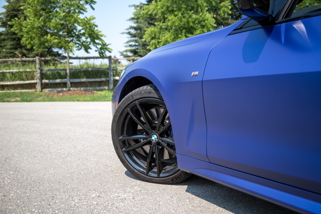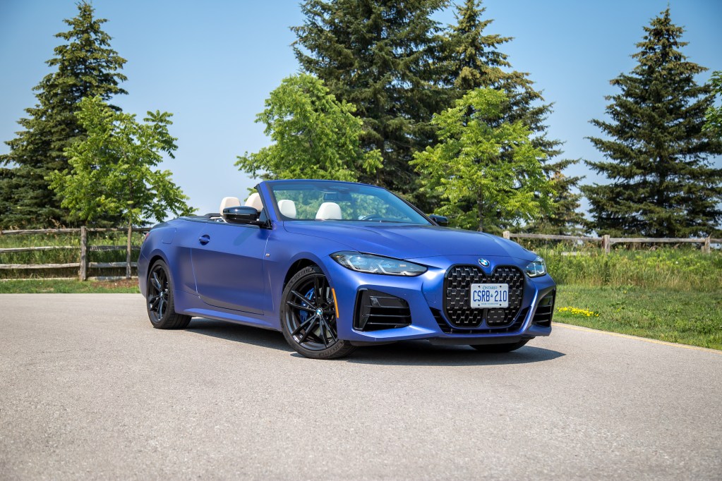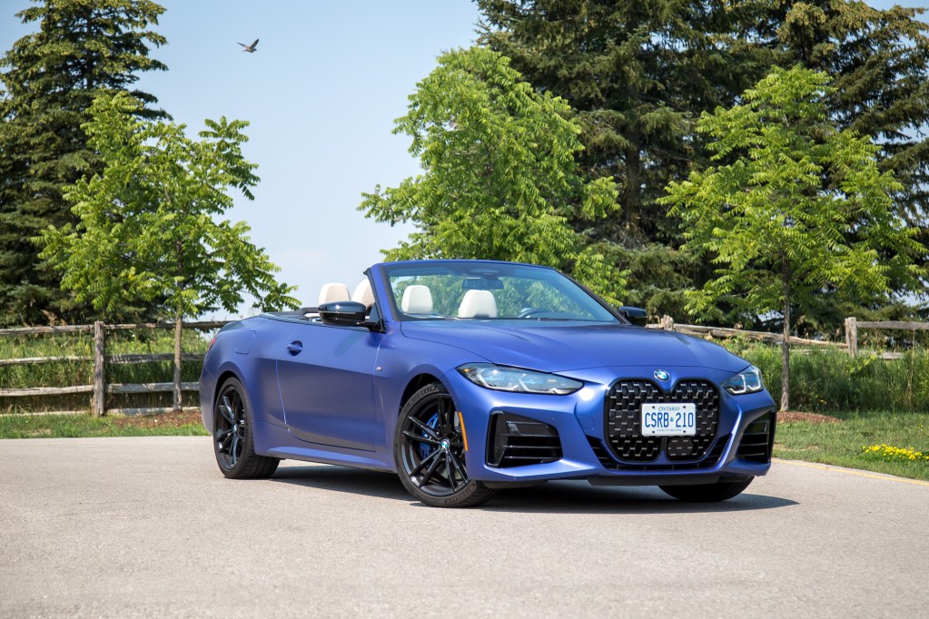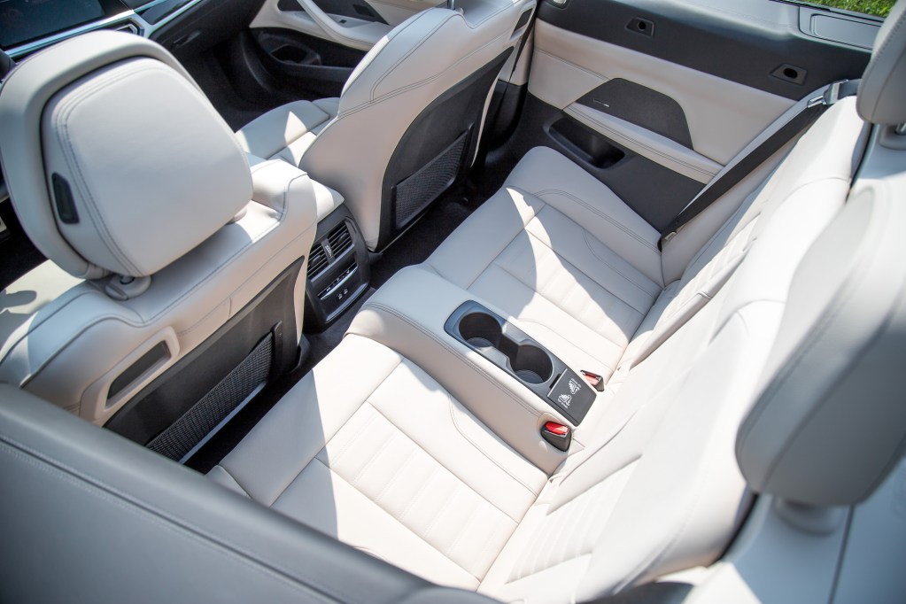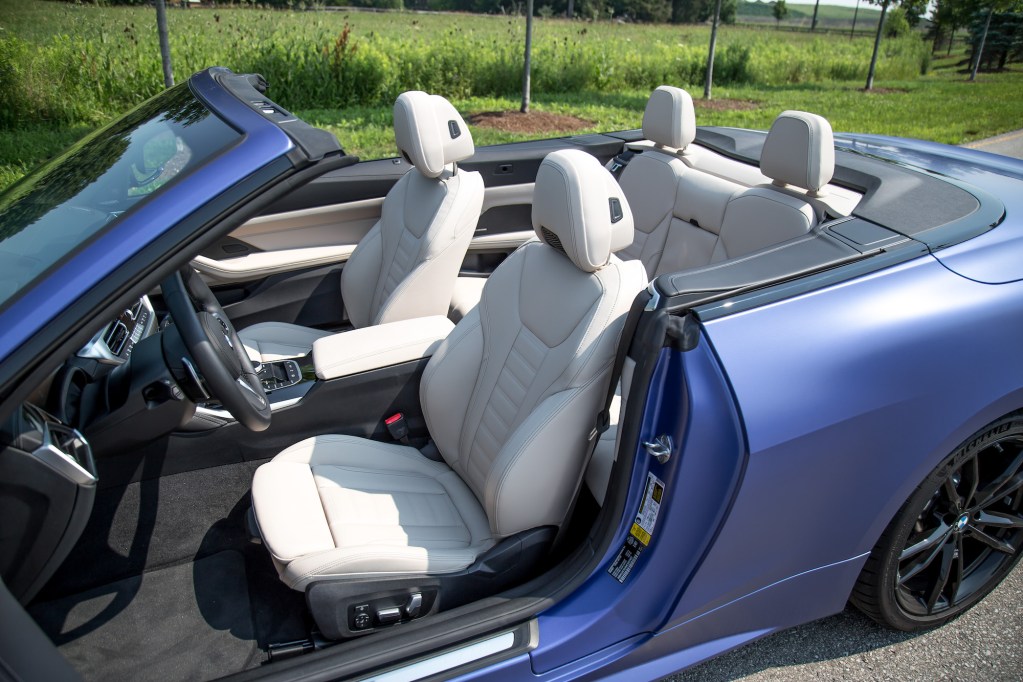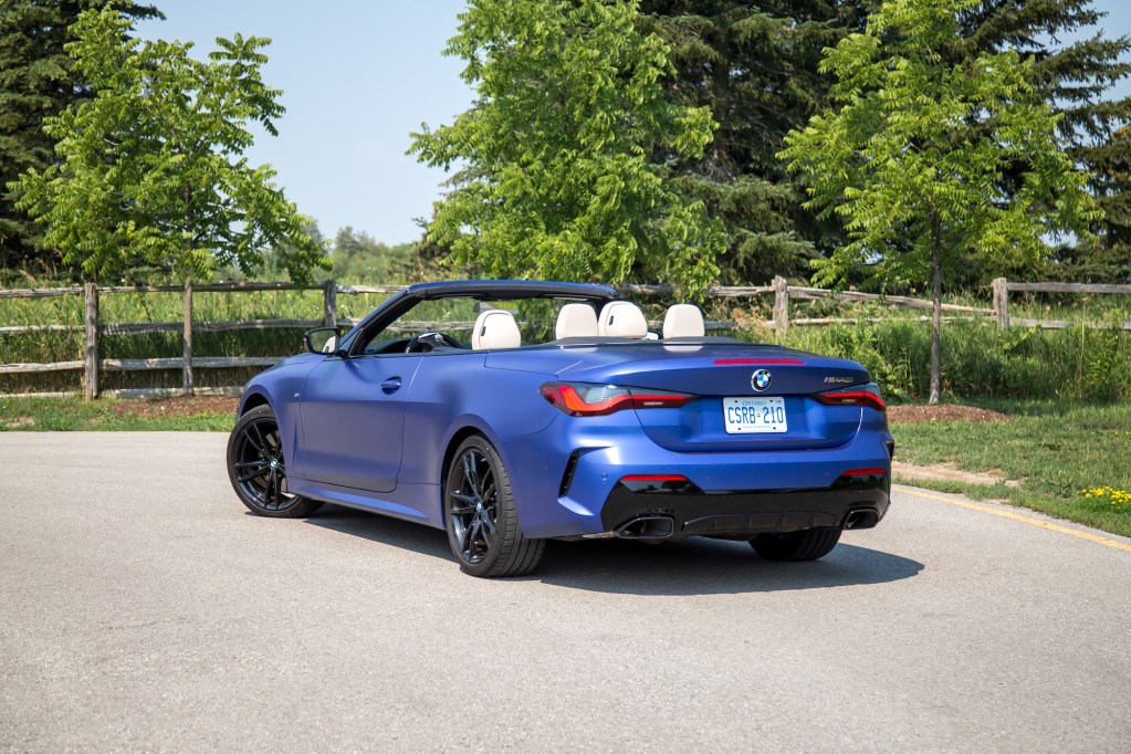 The result is a clean and attractive shape, assisted by the frameless windows, a long hood, and minimalistic lines. One advantage of the convertible is that there is no B-pillar, so rolling down both front and rear windows allows for a wide moon-shaped opening, a nifty alternative to open-air cruising during light rain or under heavy sunlight. The 4 Series looks spectacular in Frozen Portimao Blue as well, a $4,900 paint option, and the rear-end and three-quarter proportions make it easily one of the best looking convertibles to wear the roundel badge. Shame that the fabric roof is only available in black, though.