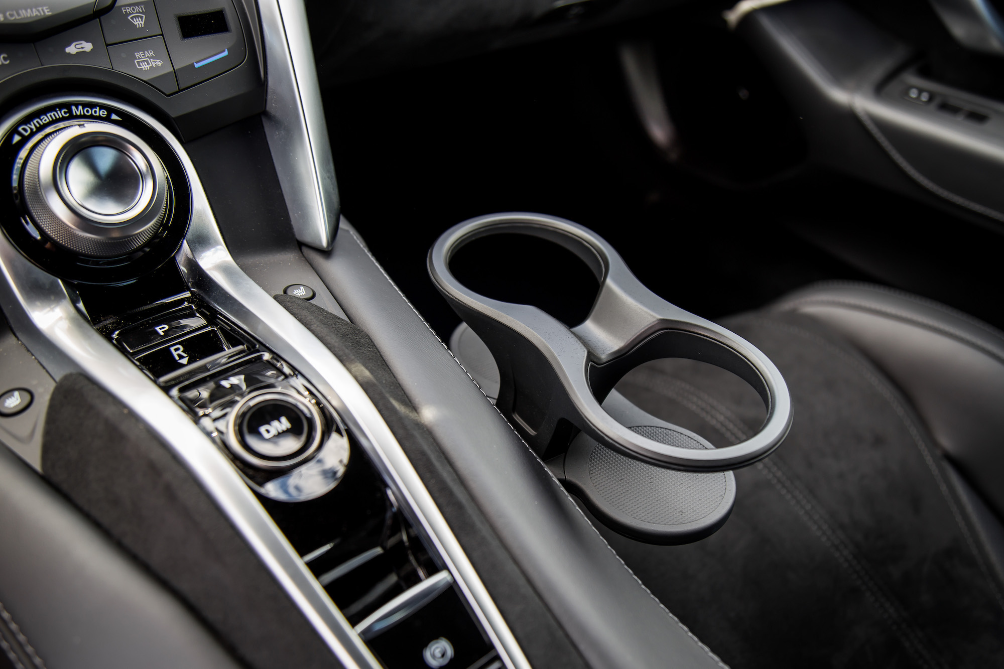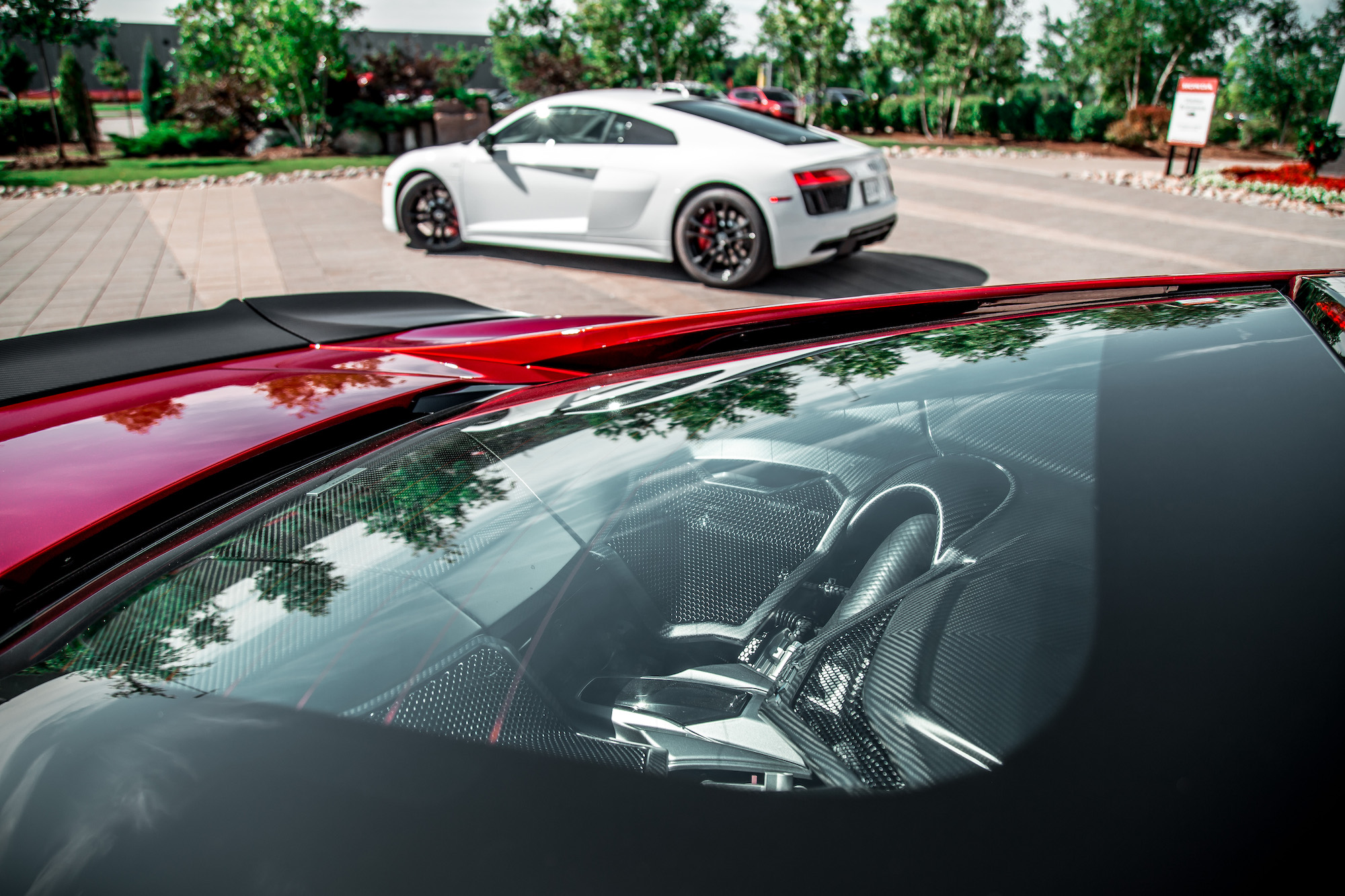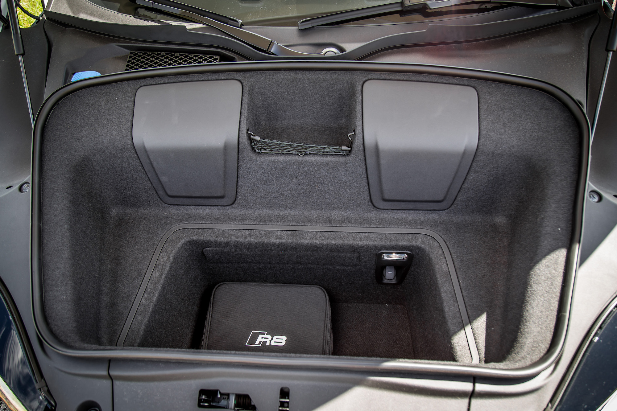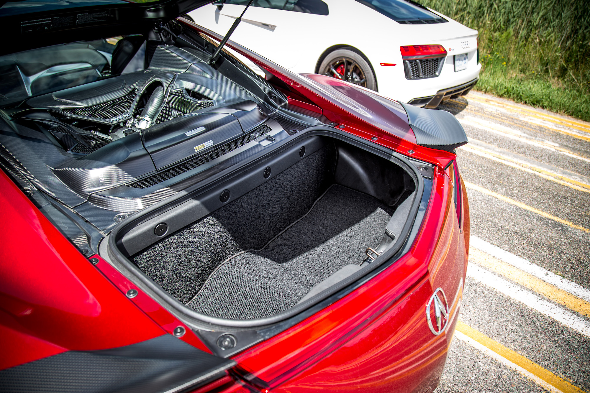 Compared to the R8, the NSX cabin is a mishmash of differently textured buttons, dials, and switchgear. Be that as it may, the NSX has the upper hand with creature comforts such as memory seating, a notable feature lacking in the R8. A shame that Sirius XM Radio and Navigation aren’t standard like they are in the Audi, though. Cargo wise, the NSX does not have a frunk but a proper trunk instead, an elongated space capable of slotting in golf clubs, a claim the R8 could only dream of. The slot is wide but shallow, whereas the R8’s frunk is deep but narrow. Storage cubbies are lacking inside the NSX as well as dedicated cupholders, but there are Miata-style clip-ons that can attach to the passenger side of the center console.