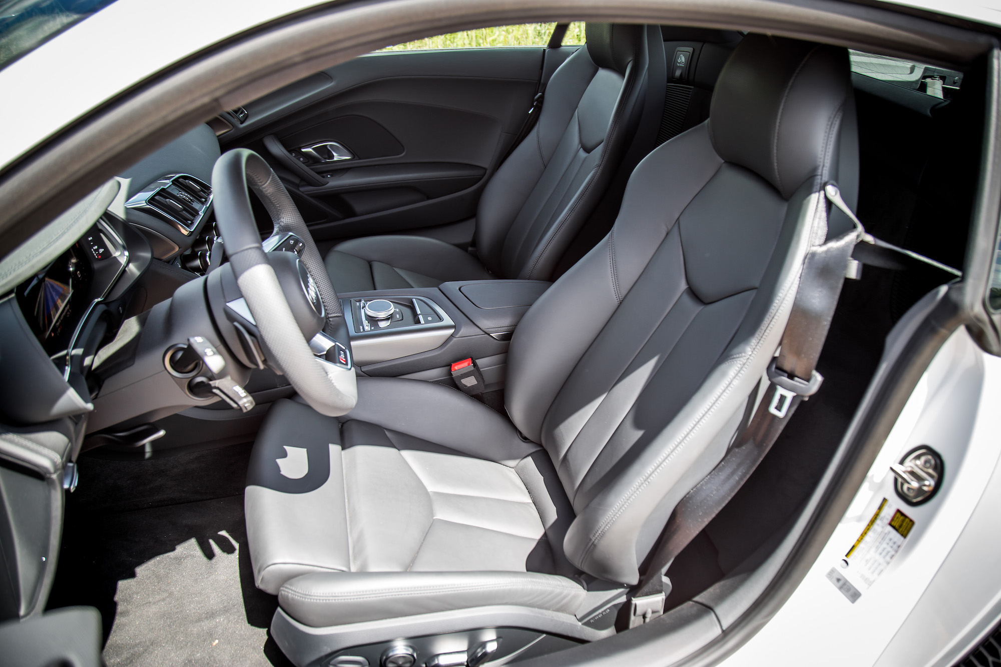 As immaculate as the cabin may be, entering it is a minor obstacle. The door sill is wide, the seats are low, and the side bolsters are hard and stiff, requiring careful choreography for balletic ingress and egress. The NSX doesn’t have this problem – you can slip in and out of it like it was a TLX. Once settled in though, the R8’s standard sport seats are supportive and well bolstered, with all the controls displayed with ergonomic mastery – we had absolutely zero complaints after a daunting rush-hour commute. Visibility is excellent from all sides, though typical of mid-engine supercars, the passenger side blind spots are atrocious, and neither the R8 or NSX are available with blind spot monitoring. Storage space in the R8 is satisfactory, with a large cubby underneath the center stack, two cupholders at elbow distance, and marginal room behind the seats with a tethered net.