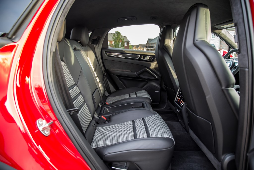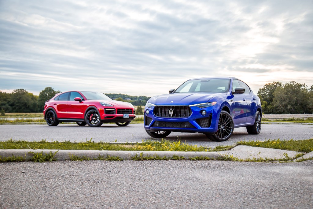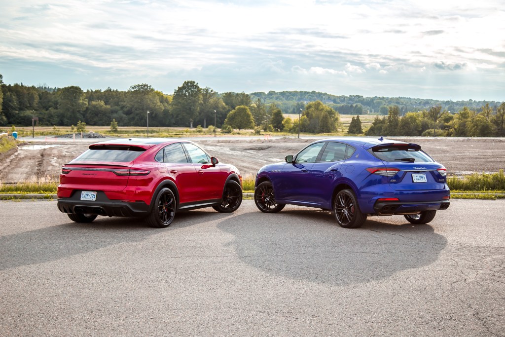 The Maserati’s 12-way seats are compromised by a stiff bottom cushion, non-movable headrest, and a limited range of adjustment compared to the Porsche’s adaptive 18-way seats, but the seating position is spot-on. Both SUVs have flat and wide window sills to comfortably rest your arms on like in the full-size Range Rover and eerily enough, rear head- and legroom, and trunk shape and volume between the Cayenne Coupe and Levante are pretty much neck and neck.
