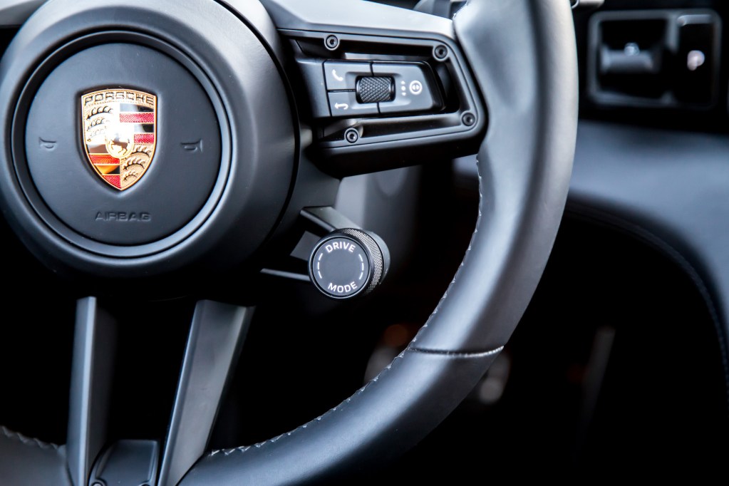 The Taycan is deafly quiet except for the occasional tire squeal, but Porsche has fitted a feature called Electric Sport Sound, optional on the Turbo, that adds futuristic electric sounds when accelerating, both outside and inside the vehicle. It doesn’t exactly replace the emotional cheer that makes you want to drive fast, but it does serve as an audible signal of how fast you’re going, an indicator that usually goes amiss in these overly hush-hush EVs. That, and it sounds like a spaceship. Who in their right mind hasn’t dreamed about piloting one of those?