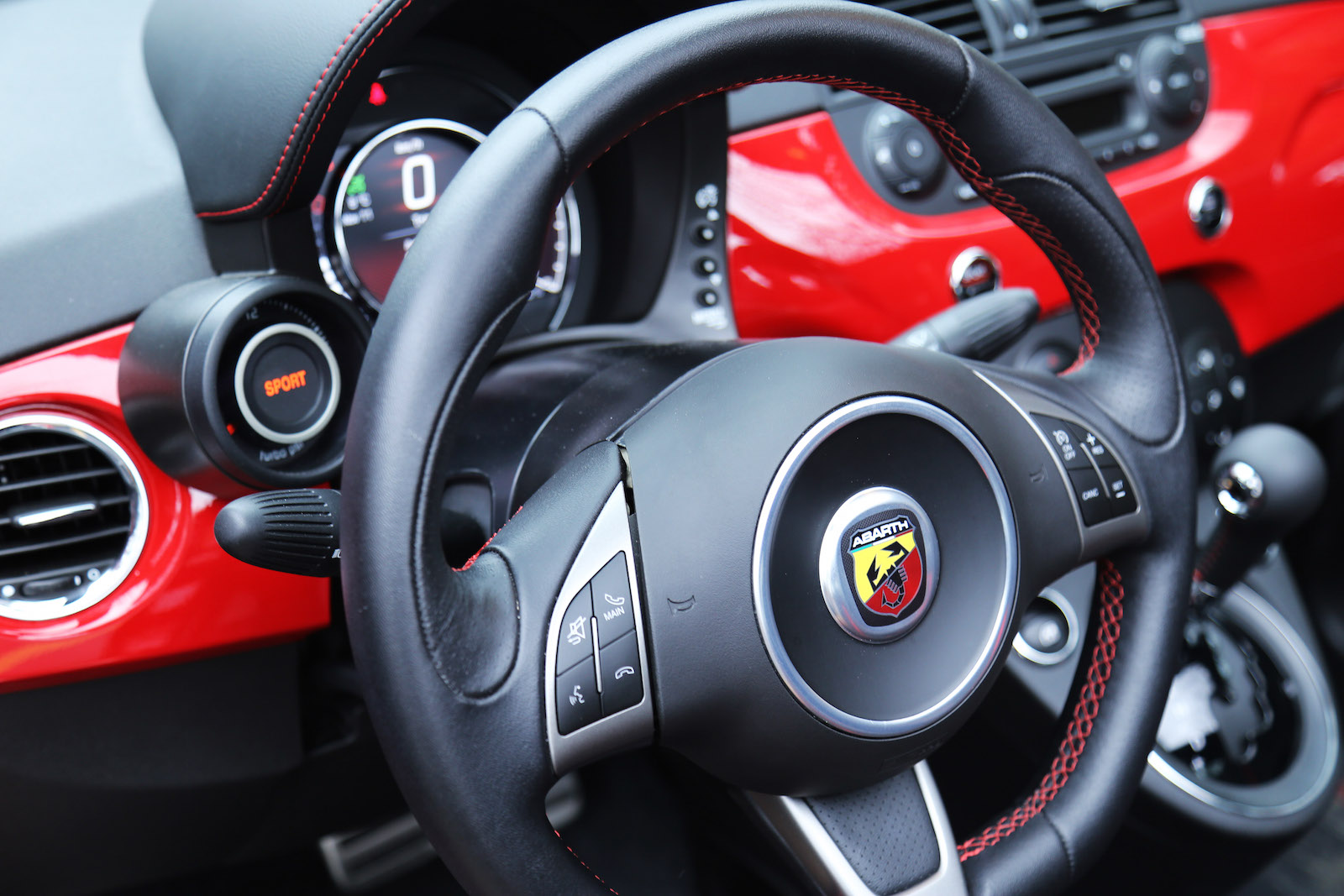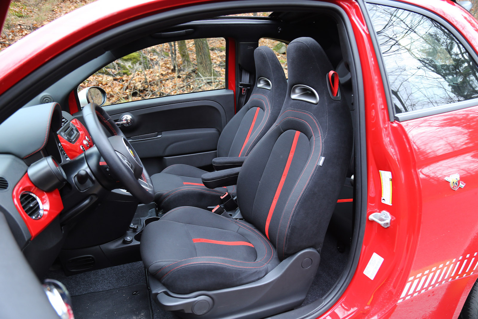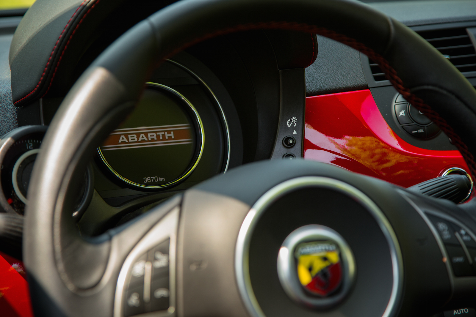 The Abarth keeps the same cute face for 2015 loaded up with a dozen air inlets on the front fascia to maximize airflow into the intercoolers and a cloth-top-mounted rear spoiler for some extra downforce. Our specific test vehicle donned a striking red paint with white ceramic wheels – it’s a combo that hits both sides of the adorable and aggressive spectrum. The Abarth logo is also one of my favourites in the automotive industry, reminding me of a Rad Scorpion from Fallout dressed in Italian colours. And that’s a good thing because I spot a total of 8 scorpion logos on the outside alone.