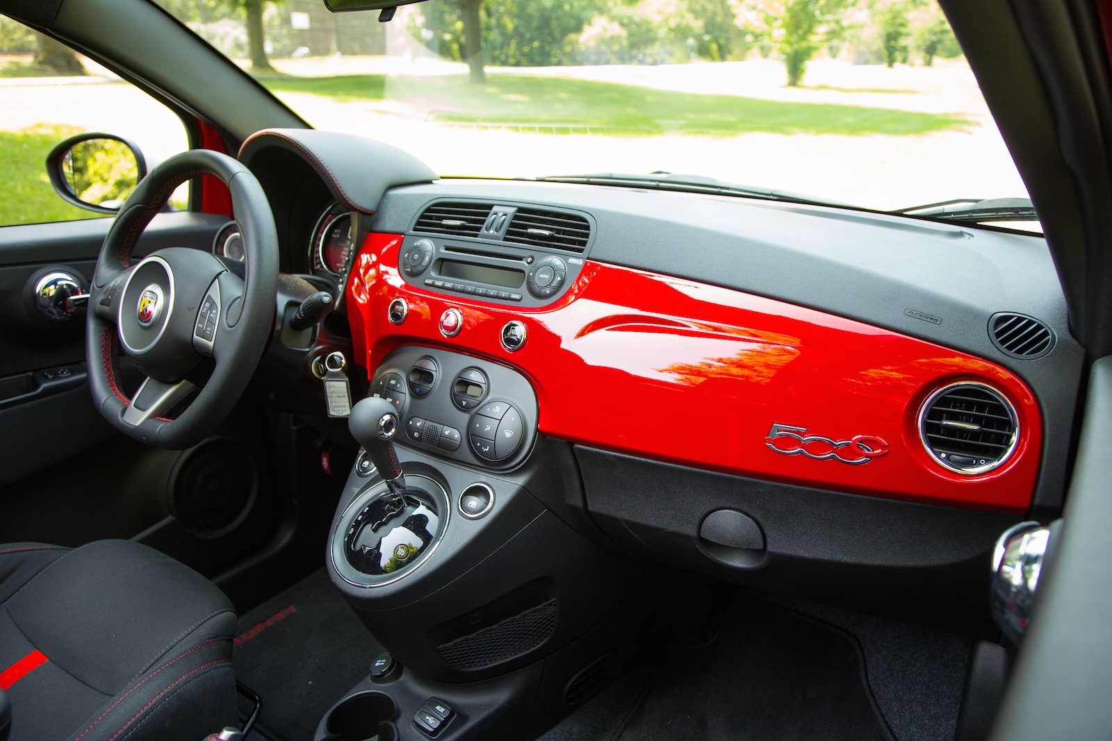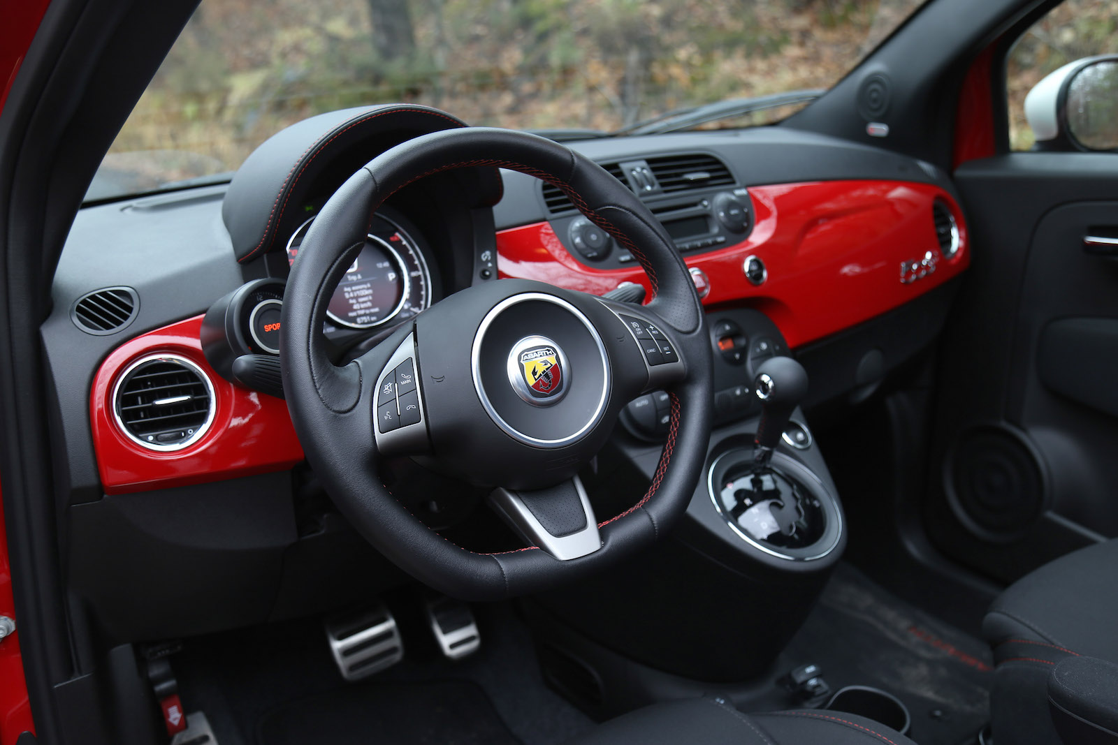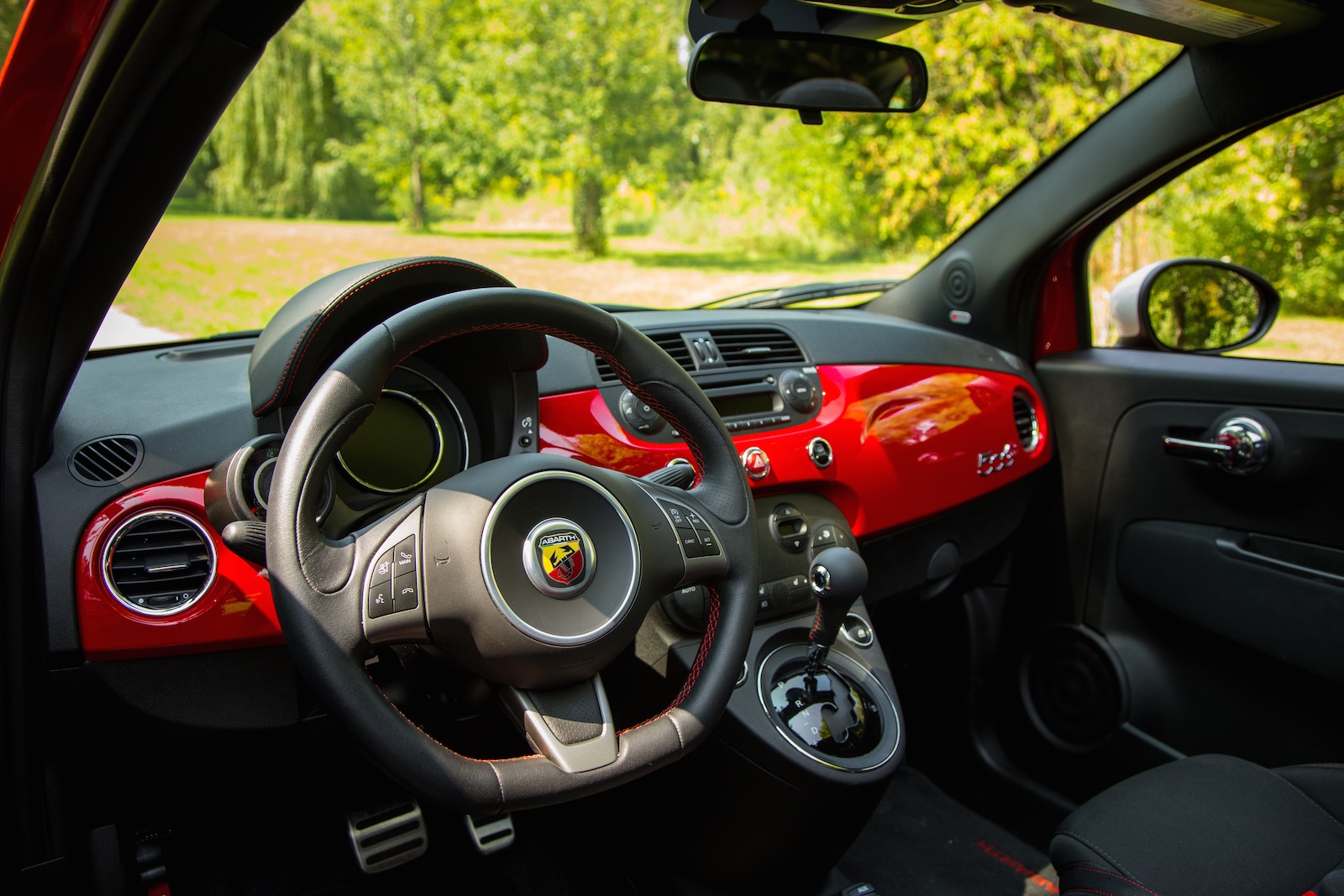 The Abarth keeps the same cute face for 2015 loaded up with a dozen air inlets on the front fascia to maximize airflow into the intercoolers and a cloth-top-mounted rear spoiler for some extra downforce. Our specific test vehicle donned a striking red paint with white ceramic wheels – it’s a combo that hits both sides of the adorable and aggressive spectrum. The Abarth logo is also one of my favourites in the automotive industry, reminding me of a Rad Scorpion from Fallout dressed in Italian colours. And that’s a good thing because I spot a total of 8 scorpion logos on the outside alone.