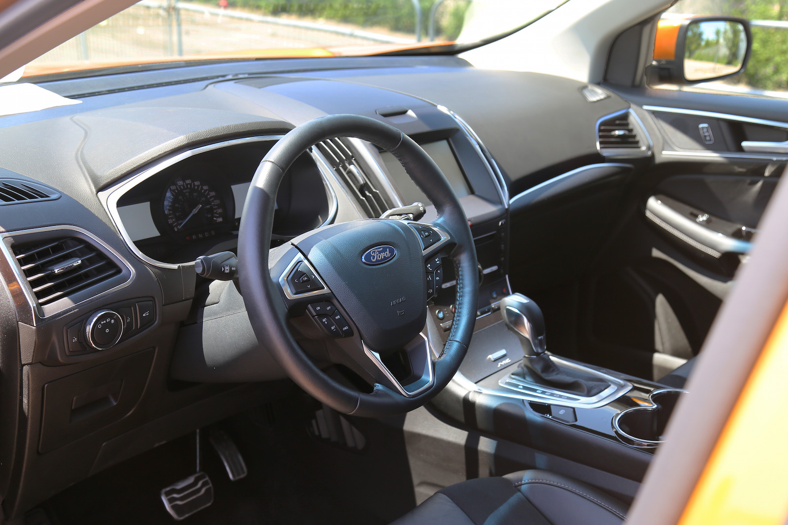 The Edge also gets sharper and edgier looks with a Taurus-inspired front grill to make it look like a swelled-up cop car. The Edge appears nimbler and sportier than it’s predecessor, and that sleek silhouette makes for a more grown-up appeal. Inside is where I saw the most change. The materials used are just staggering, even by Ford’s standards. Soft touch panels are everywhere, the amount of cabin space is more than adequate, and the ride is extremely quiet. Heated and ventilated seats are there to take the edge off, Ford’s infotainment system is intuitive and responsive, and the suspension did very well absorbing most of the bumps on the road. Overall, the fit and finish is excellent and in our opinion, it competes with upscale interiors costing thousands of dollars more.