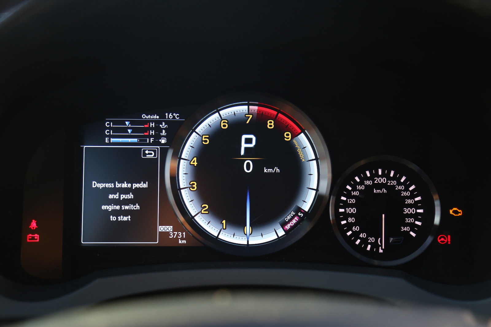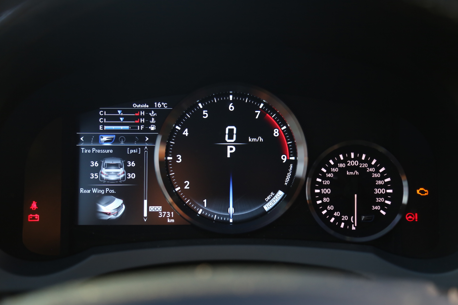 The rest of the cockpit, including the raised dashboard and sloping center stack, are borrowed from other Lexus models such as the NX and IS series. There’s also a little bit of LFA in here – just take a look at that instrument cluster! However, it’s not the same sliding tachometer that you’d find on the F Sport models; this one is the real deal. Switching between Eco, Normal, Sport, and Sport+ mode will net you a differently styled theme that displays gear changes, optimal shift times, spoiler position, a digital speedometer etc. I just don’t get why they placed a redundant analog speedometer on the bottom right of the panel.