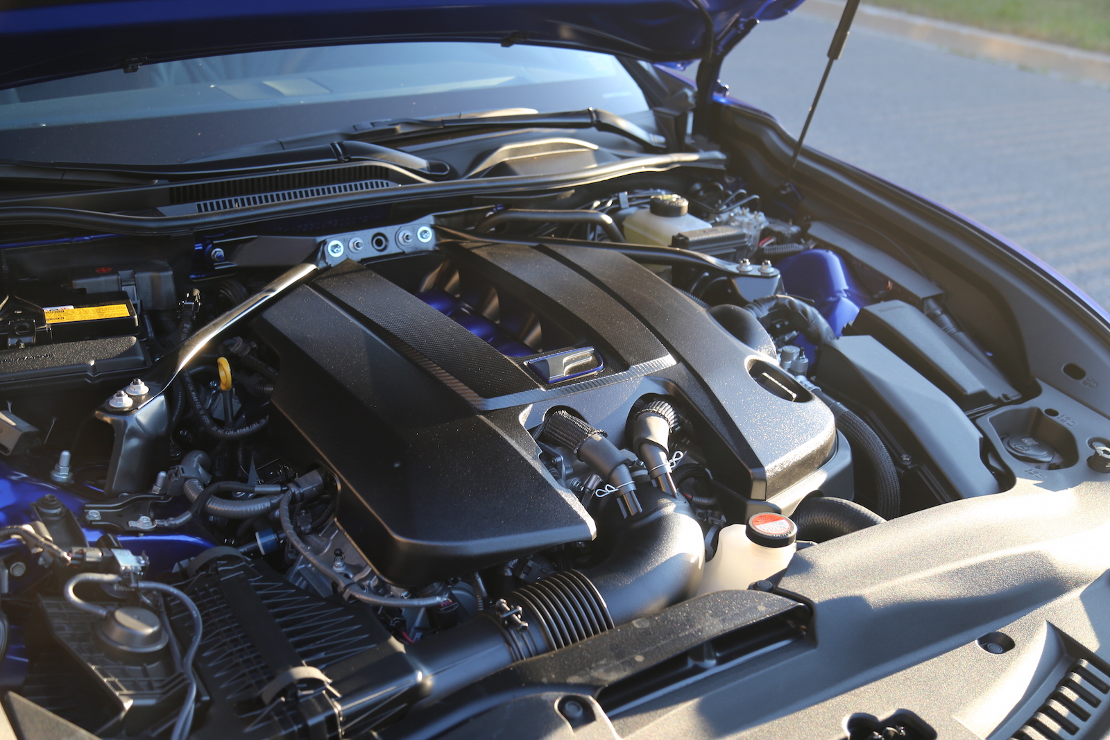 Sadly, natural aspiration (an engine without turbos or superchargers) has become a dying breed of performance engines; just take a quick look at the competition. The BMW M4 went turbo, and so did the Mercedes-AMG C63 and Cadillac ATS-V. Not Lexus though, and that’s what makes the RC F so attractive over its sporty rivals. It’s stuck in the last hurrah of gas guzzling high-pitched eight-cylinder rocketships. Under the hood of the RC F is an upgraded version of the IS F’s 5.0-litre V8 with a larger throttle body, new heads with titanium valves, and lighter connecting roads (the upcoming Lexus GS F will also use this motor). The result is 51 more horsepower than the IS F for a total of 467 hp. The engine mapping has also been revised so that power arrives earlier and the redline stretches even higher, up to 7,300 rpm. Peak horsepower comes at 7,100 rpm so you’re going to have to rev real high to squeeze out all that V8 juice. Not that you’d mind, because the higher that needle moves, the better it sounds.