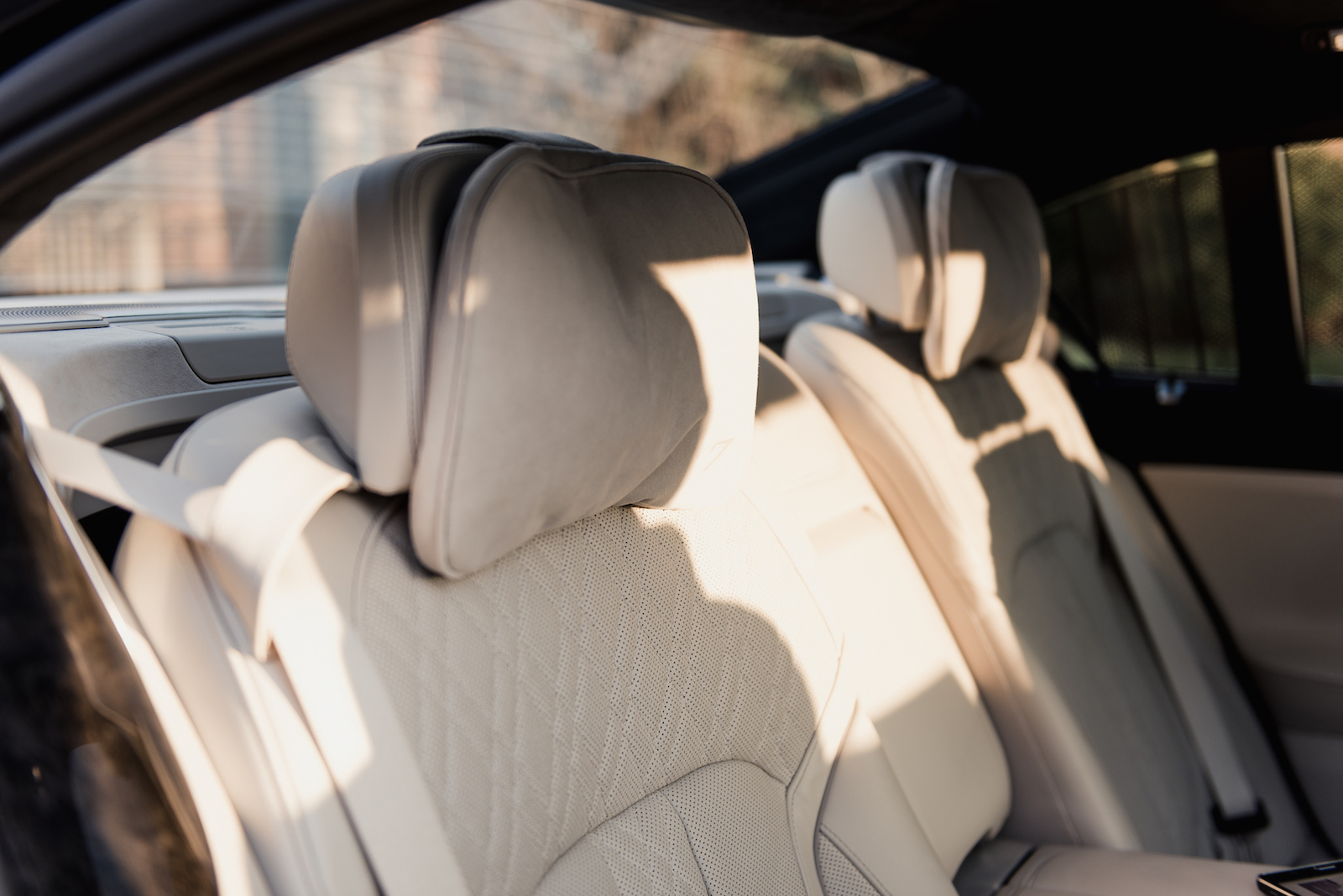 Whether you’re sitting in the front or the back, the seats are cosseting and sumptuous. Tilt your head up and you’ll also notice a pattern of lights etched into the sunroof made to mimic the stars in the night sky. There are 15,000 of those starry lights merged into the glass, and you can customize which colour you want them to emanate.