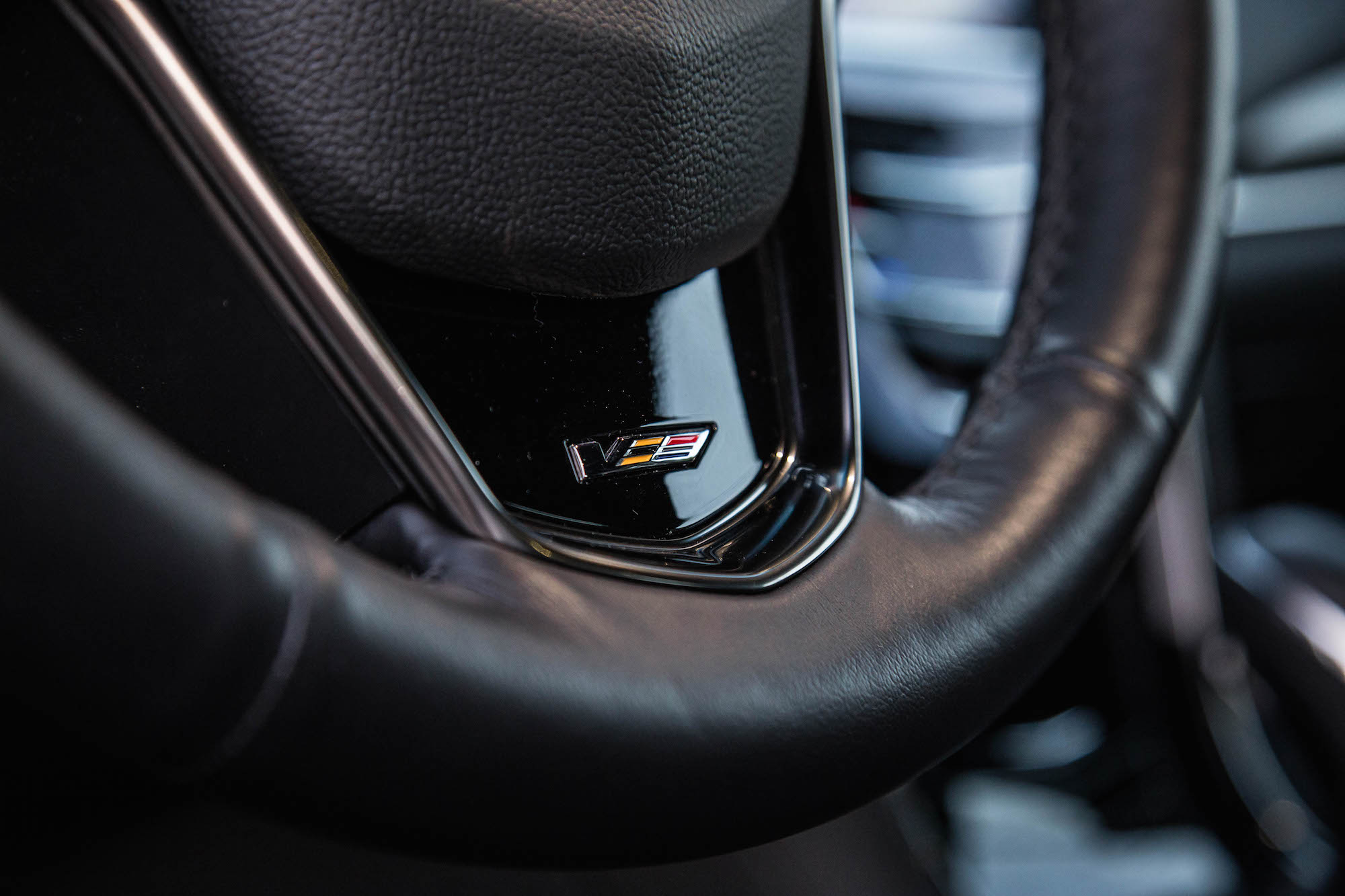 While the Caddy’s interior doesn’t feel as upmarket as the M4, it is still a wonderful place to spend time in. It won’t convert current Euro coupe customers with its abundant use of thin plastic, but the remaining panels feel rich, creamy, and appease to the senses. The concave steering wheel isn’t bound for any awards, but in V-spec it gets bulked up with an extensive use of leather, while a nice little V badge sits at the bottom to remind the driver that this is no regular Cadillac.