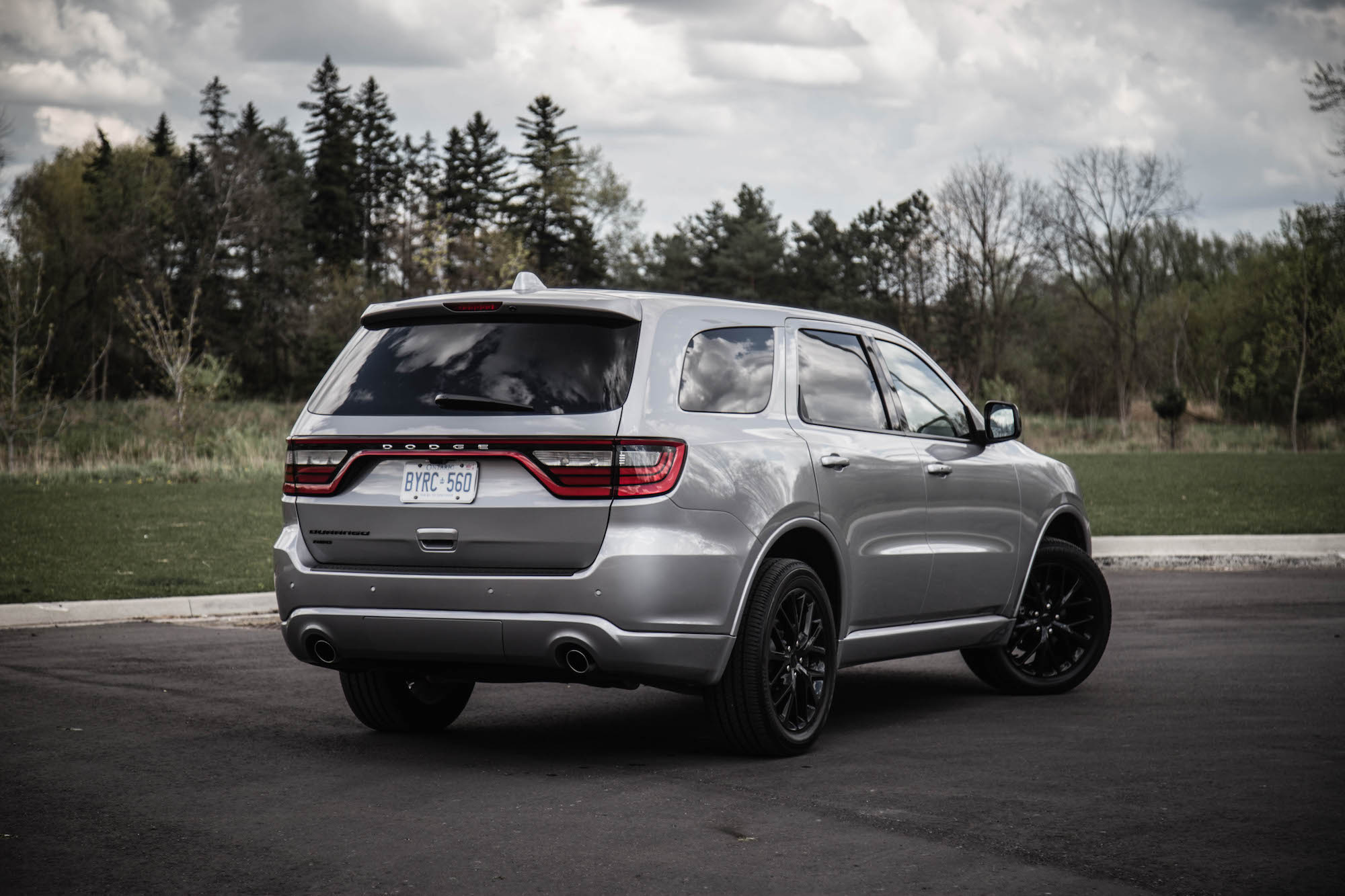 Where the Durango stands out from the crowd is with its athletic character and muscle car stance. The Durango has always looked sporty, like a Town and Country that took too many steroids. But our particular tester was loaded up with the Blacktop Package ($1,595) that adds a blacked out grill, 20-inch wheels, mirrors, badges, headlamp bezels, bright exhaust tips, and body-coloured panels. Looks pretty sinister doesn’t it? Out back, the Durango also gets the racetrack taillamp treatment with 192 little LEDs giving off that signature glow also found in the Dodge Dart and Charger.