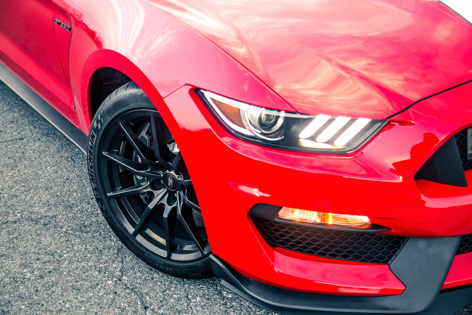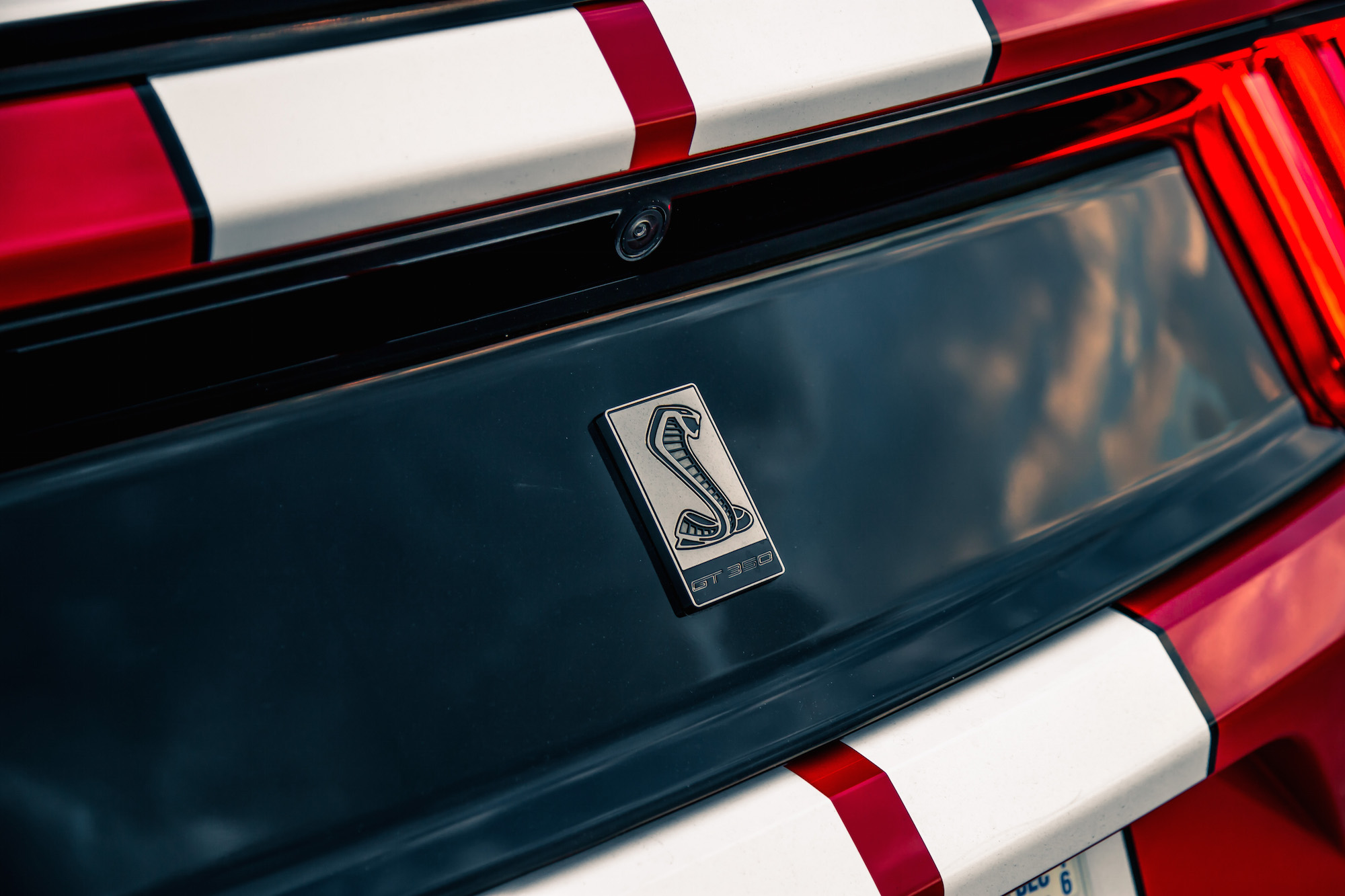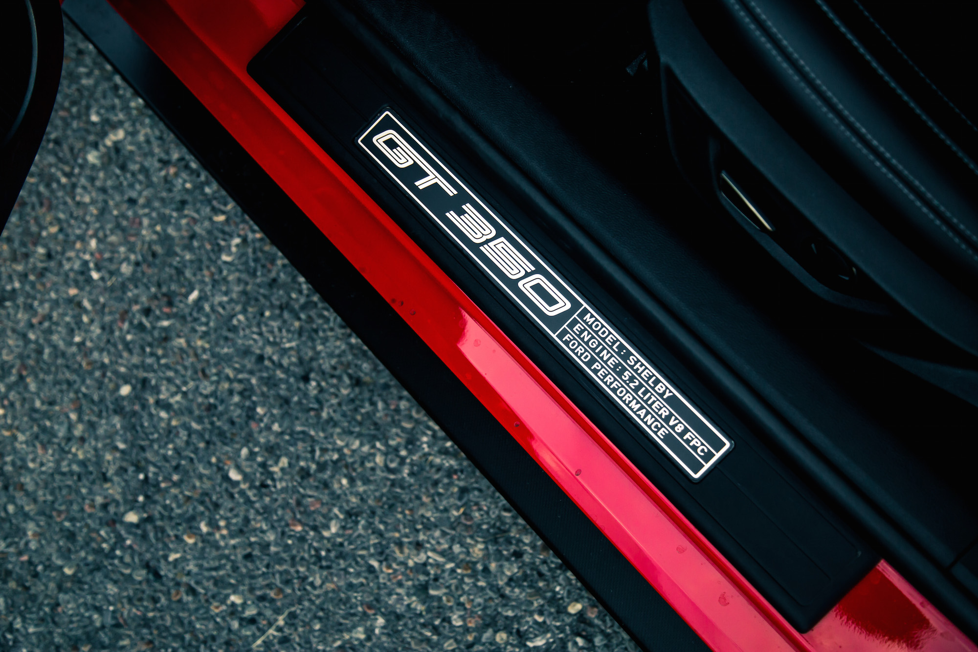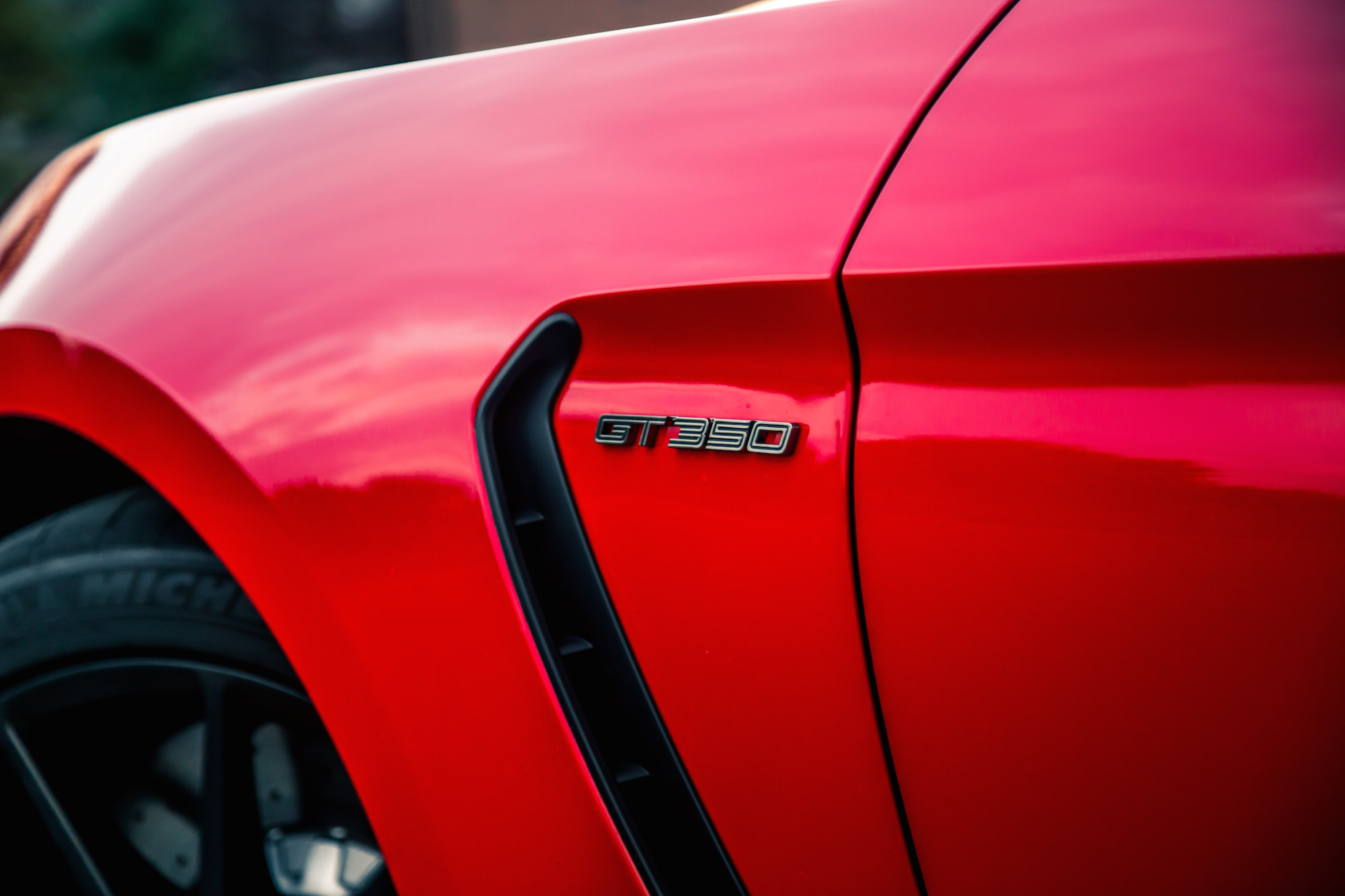 The GT350 receives a new front splitter, bumper, sculpted hood, cobra badges, flared fenders, a fresh set of Michelin Pilot Super Sports, and a rear spoiler that compliments its wider track.