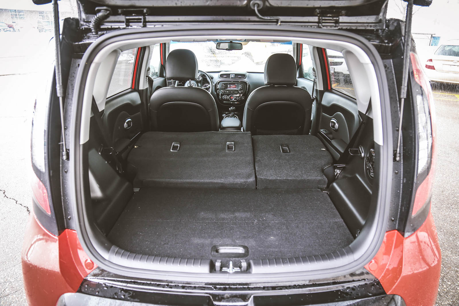 We also loved the concealed storage area underneath the trunk mat – a hidden cubby bin with divided sections so that your pet doesn’t stomp all over your delicate groceries. In all, the Kia Soul offers 532 L of space with the seats upright, and 1,402 L with the rear seats down.