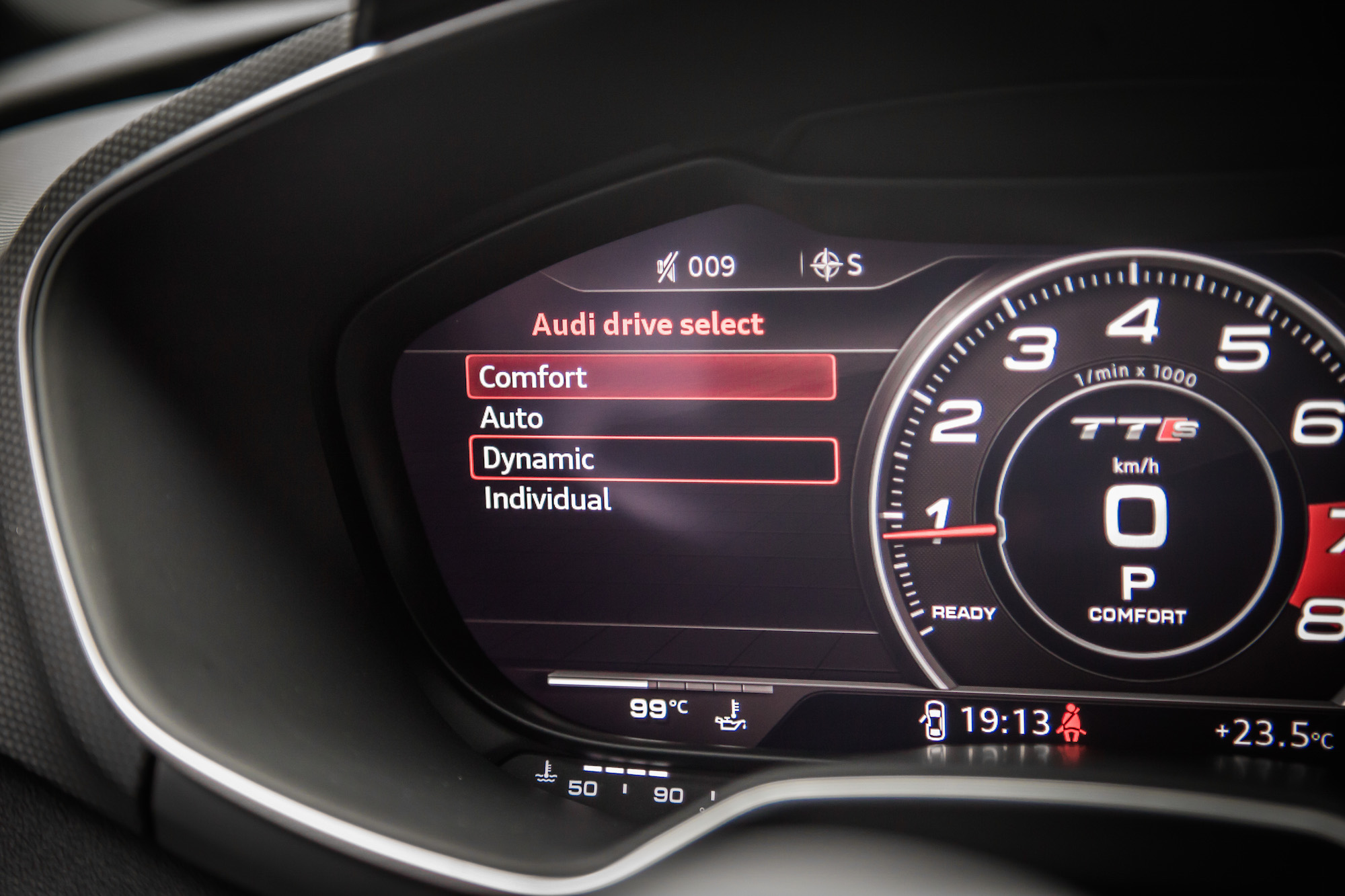 Inside the new TT is quite special too. The overall theme here (as with all Audis) is functionality. Every button and panel has a purpose. Though I’ve always found Audi interiors to be stark, dark, and gloomy, I have to admit that the new steering wheel, nifty vent controls, and overall setup is very driver-focused and engaging. The Golf-R-like steering wheel also has flat dimples just below the 9- and 3-o’clock position for better grip.