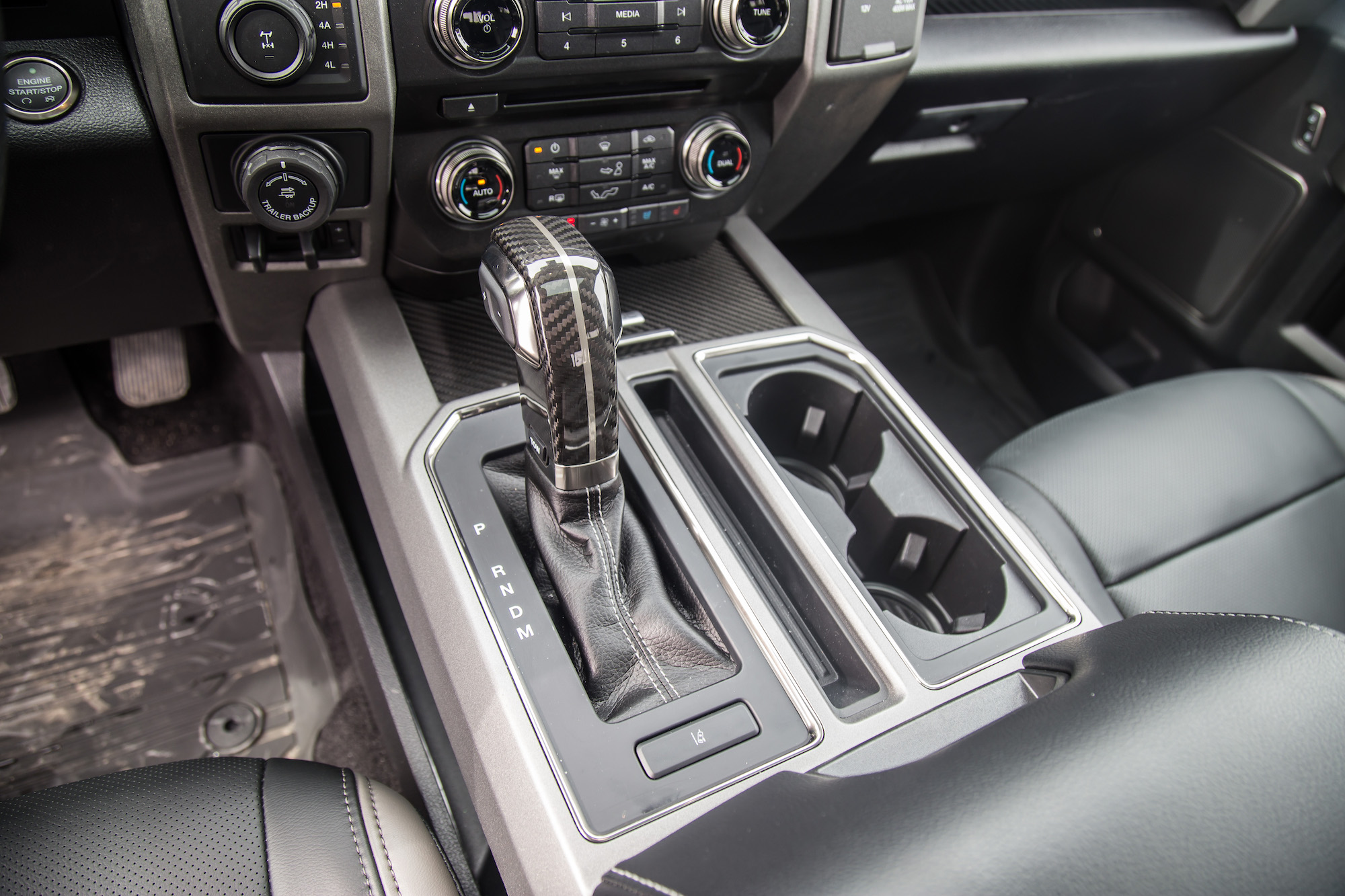 While most of these are features that can be found in the regular F-150, the Raptor’s cabin stands out with a red-striped steering wheel, optional carbon fibre trimmed panels ($1,250) that wrap the dash, door panel, and gear shifter, “Ford Performance” labeled door sills, “Raptor” stitched seats, and wheel-mounted magnesium paddle shifters that feel like the ones in Maseratis. Clunky and cold to the touch when the fans are blowing, these are paddles you wouldn’t mind flapping – and you’ll be flapping em’ lots if you want to cycle through each of its ten gears.