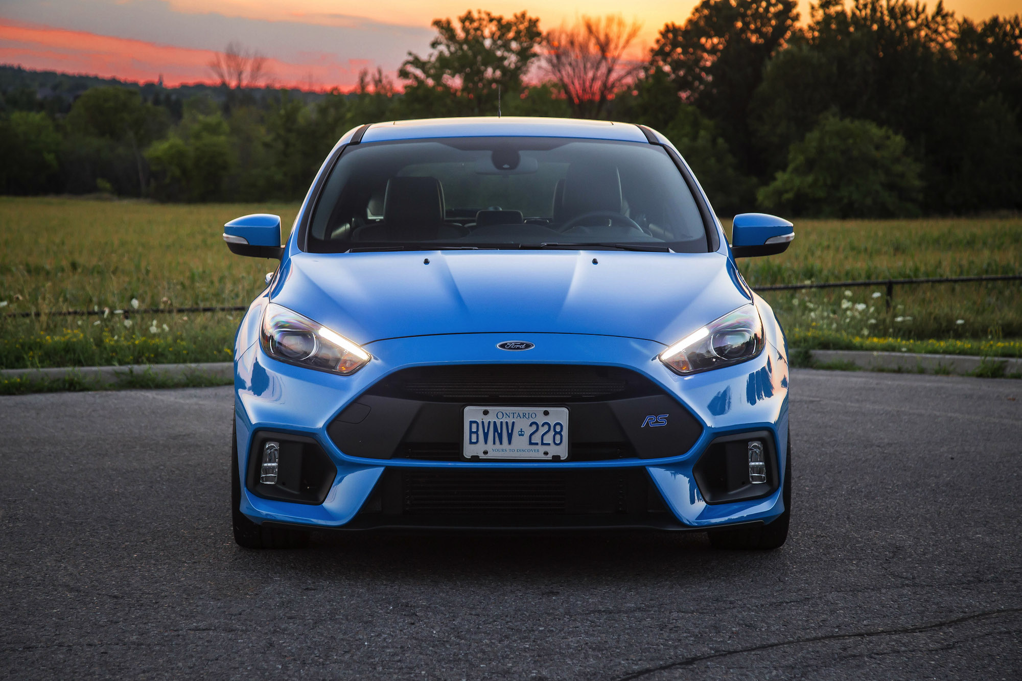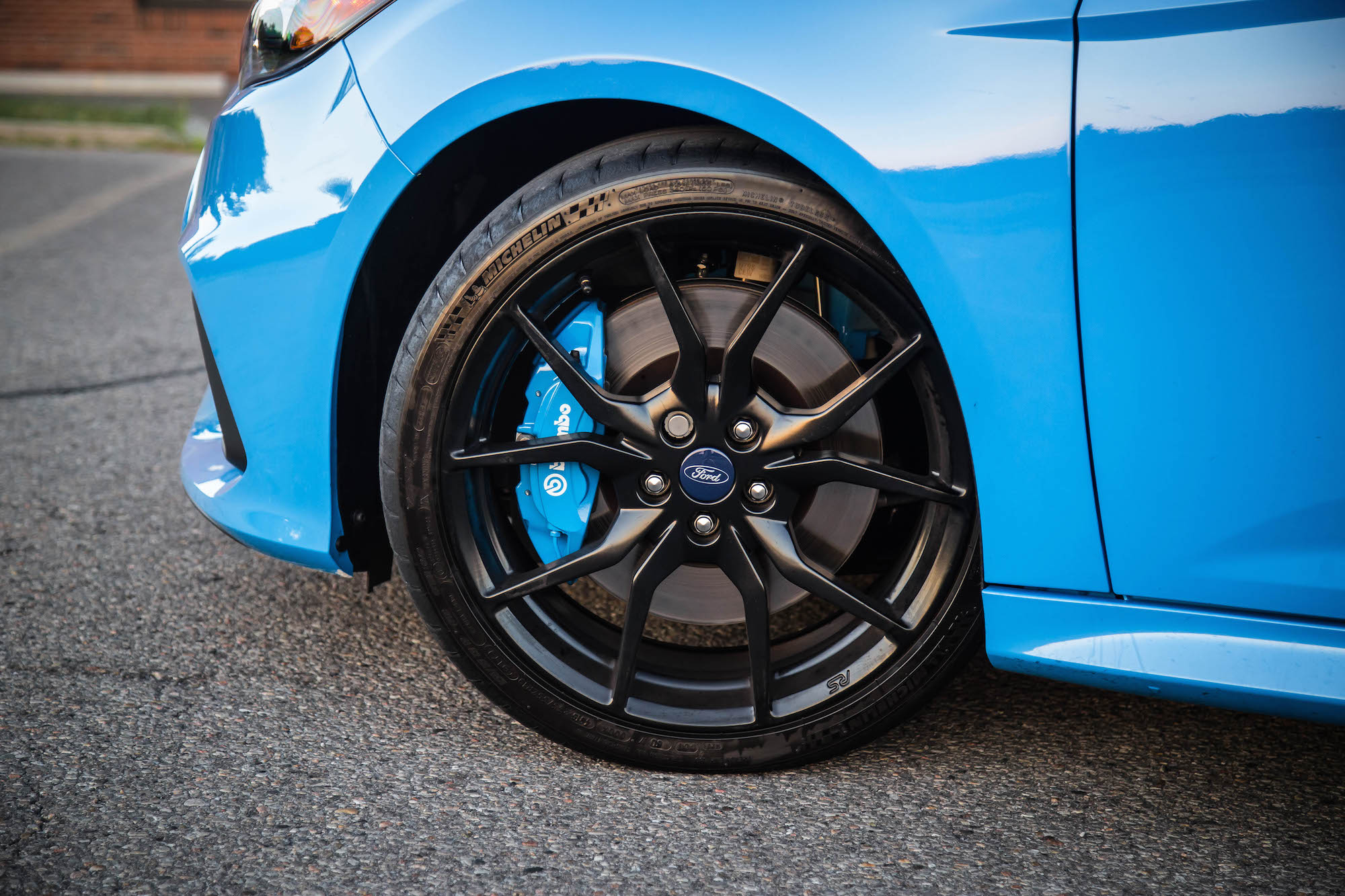 But that’s not all. The RS gets stiffer springs (33% stiffer in the front and 38% in the rear compared to the Focus ST), bigger four-piston brakes, and a fixed steering rack. The bodywork is nothing shy of a rally car either, sporting a planetary hatch spoiler, a new front grill that looks like its wearing a retainer, a more aggressive bodykit, 19-inch wheels, and the most obnoxious yet sexy hue of Nitrous Blue paint I’ve ever seen on an “economy” rooted vehicle.