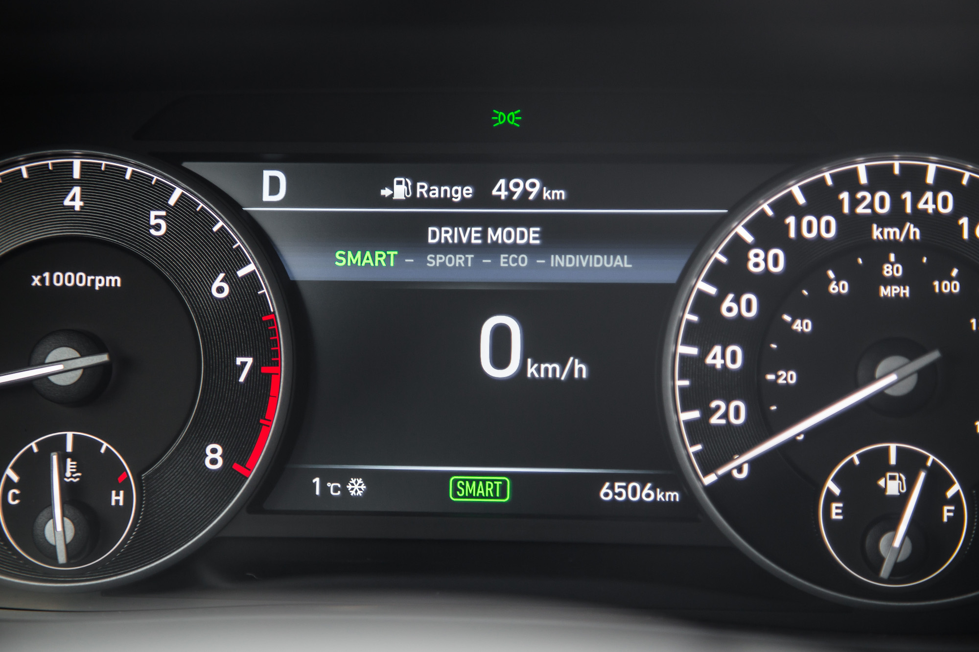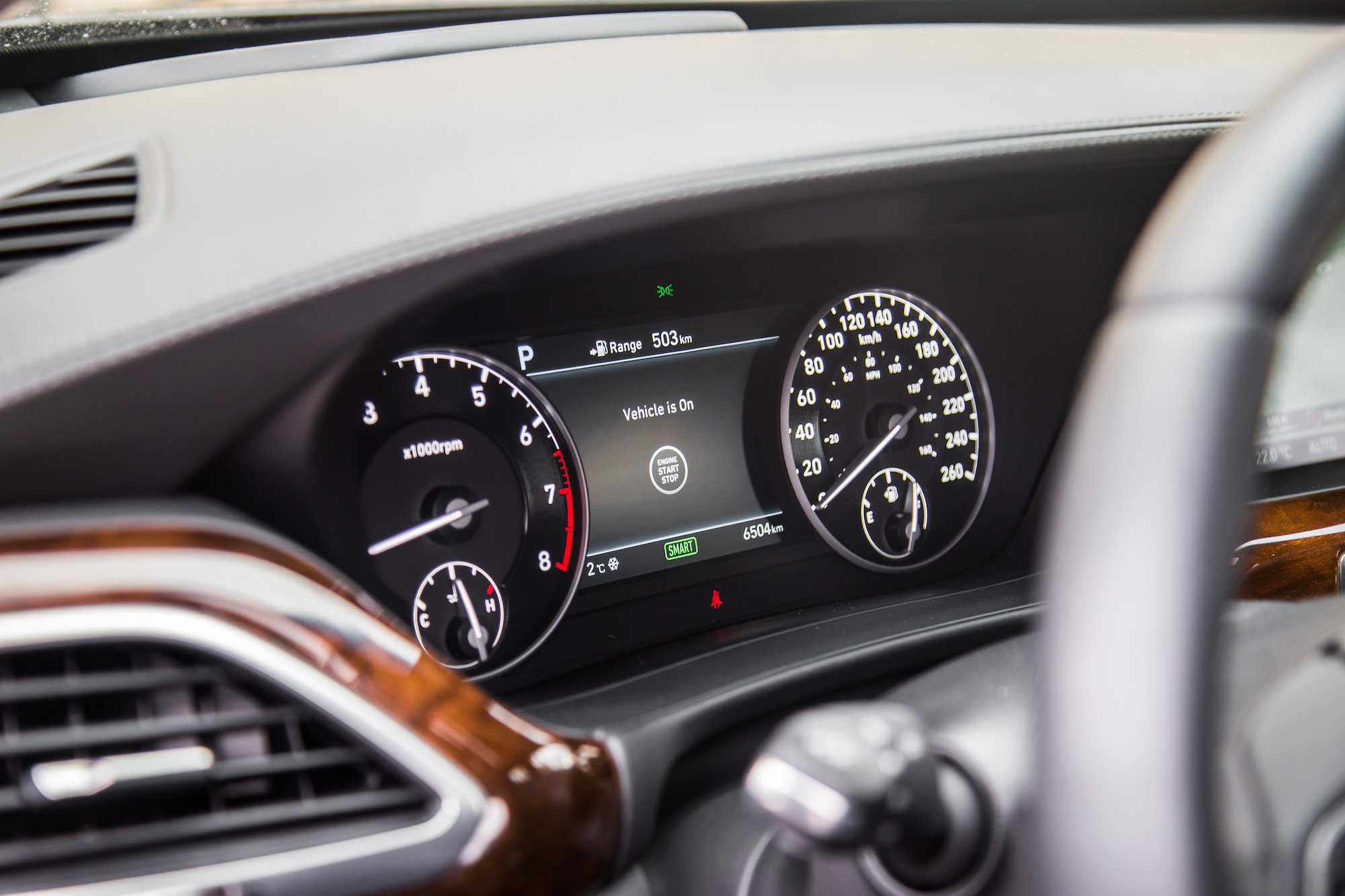 The G90 offers four driving modes to choose from via a button on the center console: Smart, Eco, Sport, and Individual, each programmed to change the firmness of the suspension, throttle response, transmission mapping, and all-wheel drive bias. The Smart setting was the most intriguing, analyzing our inputs to provide a Goldilocks compromise between all modes. Dynamically however, the G90 is not quite there. Its AWD system is too conservative and though it becomes rear-wheel bias in Sport Mode, it skips and scampers around in corners and doesn’t take the weight transfer too well under duress.