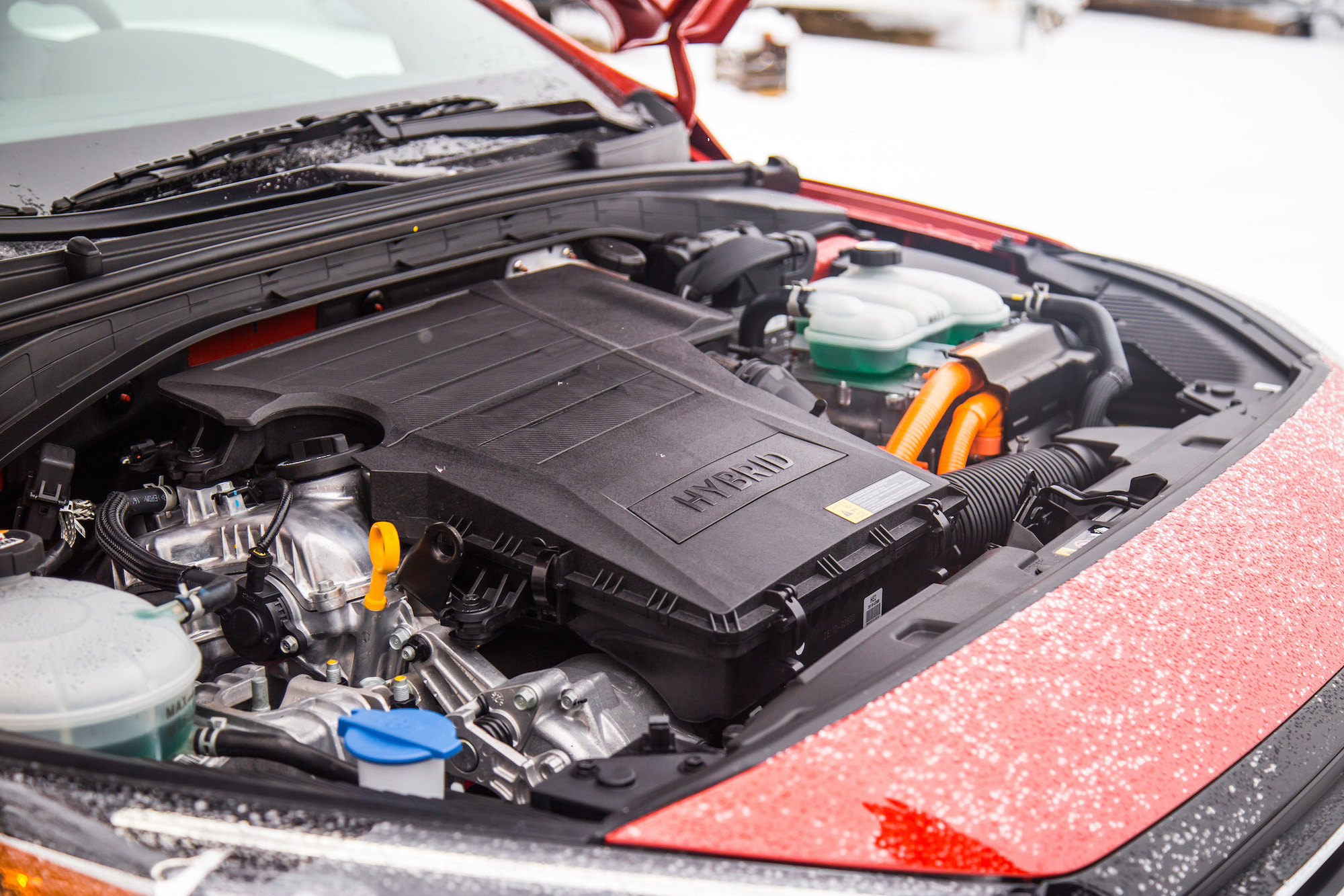 The first thing we noticed driving the Hybrid was how quiet it was. Road noise was primarily absent even at triple digit speeds, and the cabin was free from rattles or scuttle shakes thanks to a rigid structure. The only noise seeping in was the Michelin X-Ice Xi3 tires rolling against the snowy pavement (these aren’t standard tires but were equipped to deal with the falling white powder).