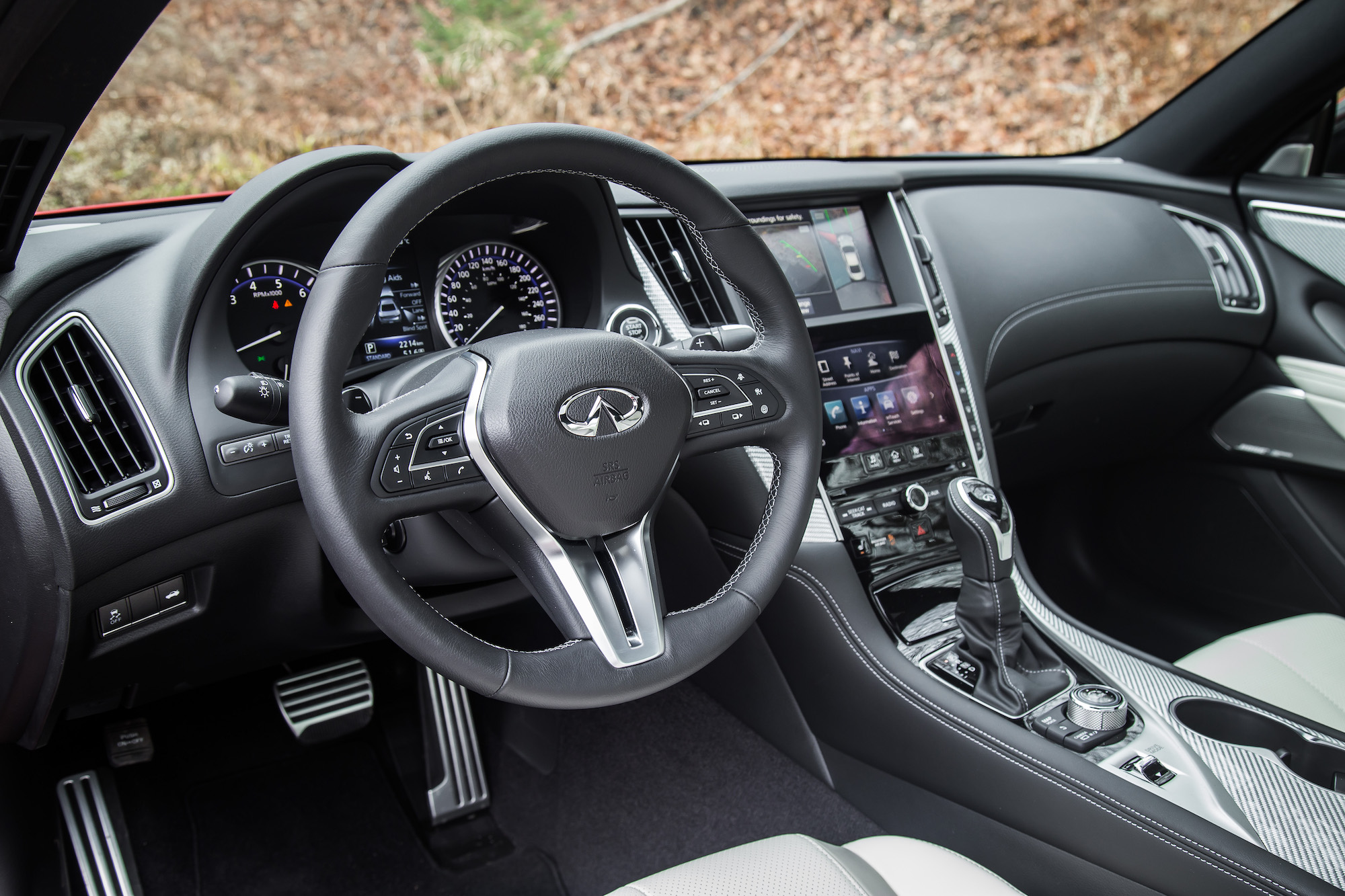 The materials used are also up to snuff, namely the magnesium paddle shifters and upgraded sport seats wrapped in the same supple semi-aniline leather that you find in the QX80 mothership. There is no head-up display, ventilated seats, Apple CarPlay, or even a digital speedometer available, but other expected amenities such as a 360-degree camera, blind spot monitoring, and your slew of safety systems are available, as well as a premium Bose system that lodges speakers on the door panel and along the length of the entire dashboard.