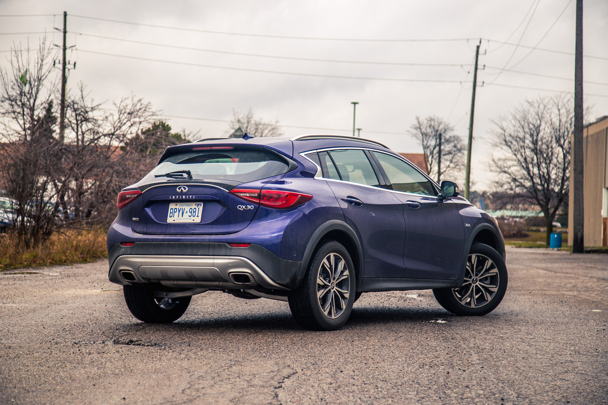 The QX30 is more of a tall hatchback than an actual crossover, and you can definitely feel it when you fling it hard around the bends. There’s lots of body roll with only moderate understeer. The AWD system works well here to shuffle torque to the correct wheels, and even during Toronto’s first snowfall last week, the QX30 trekked through the snow covered roads without breaking a sweat.