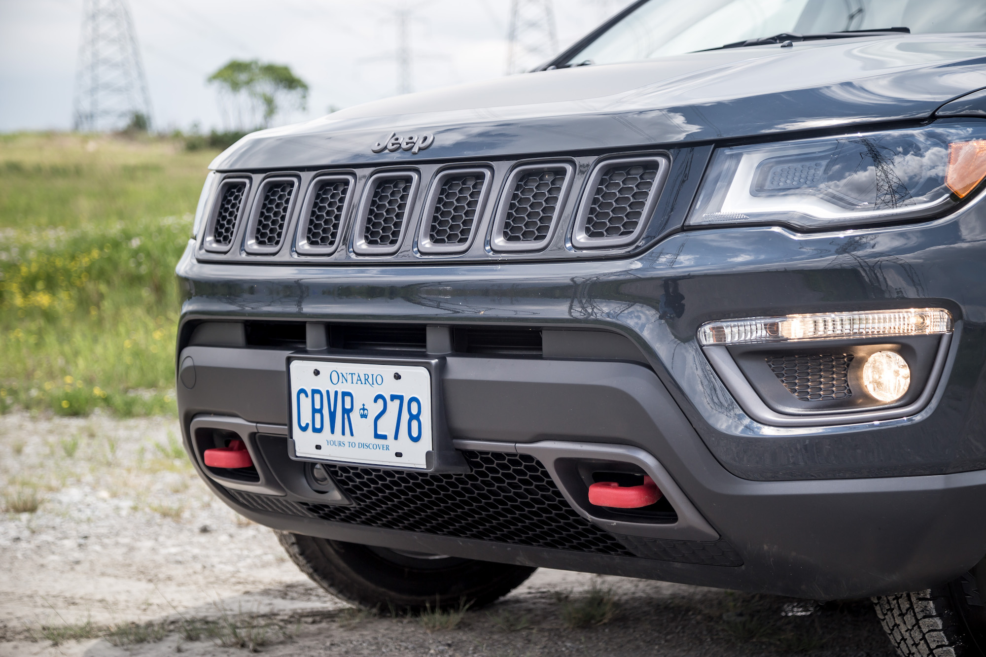 For clarity, we spent a week with the 2017 Jeep Compass Trailhawk, the off-road variant of the Compass lineup. This meant 17-inch off-road tires, a full-time 4×4 system with 20:1 crawl ratio, around 25 mm of increased ride height, unique front and rear bumpers to aid in better approach, breakover, and departure angles during off-roading, an anti-glare hood decal, black grill surround, red interior accents, a black roof, all-season floor mats, skid plates, Hill Descent Control, leather-faced seats, stiffer off-road suspension, and signature red tow hooks (two up front and one in the rear).