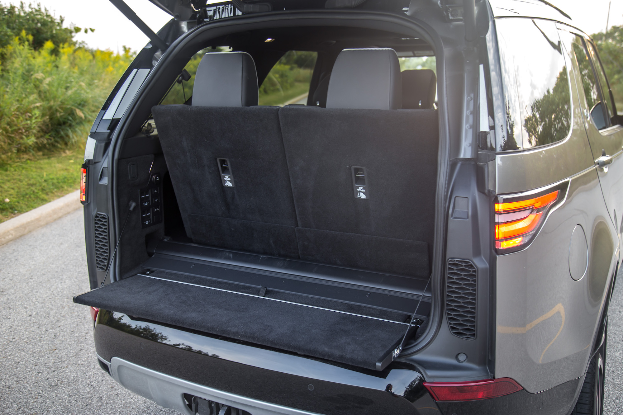 The tailgate works a little differently than the Range Rover. The Discovery utilizes a one piece tailgate but has an inner electronically operated tailgate that folds out for easier cargo loading and makes for a nice platform or bench for sitting at a drive-in movie theatre. With the keyfob in your pocket, you can also kick your feet under the rear bumper to automatically open the tailgate as well – helpful when your hands are full of groceries.