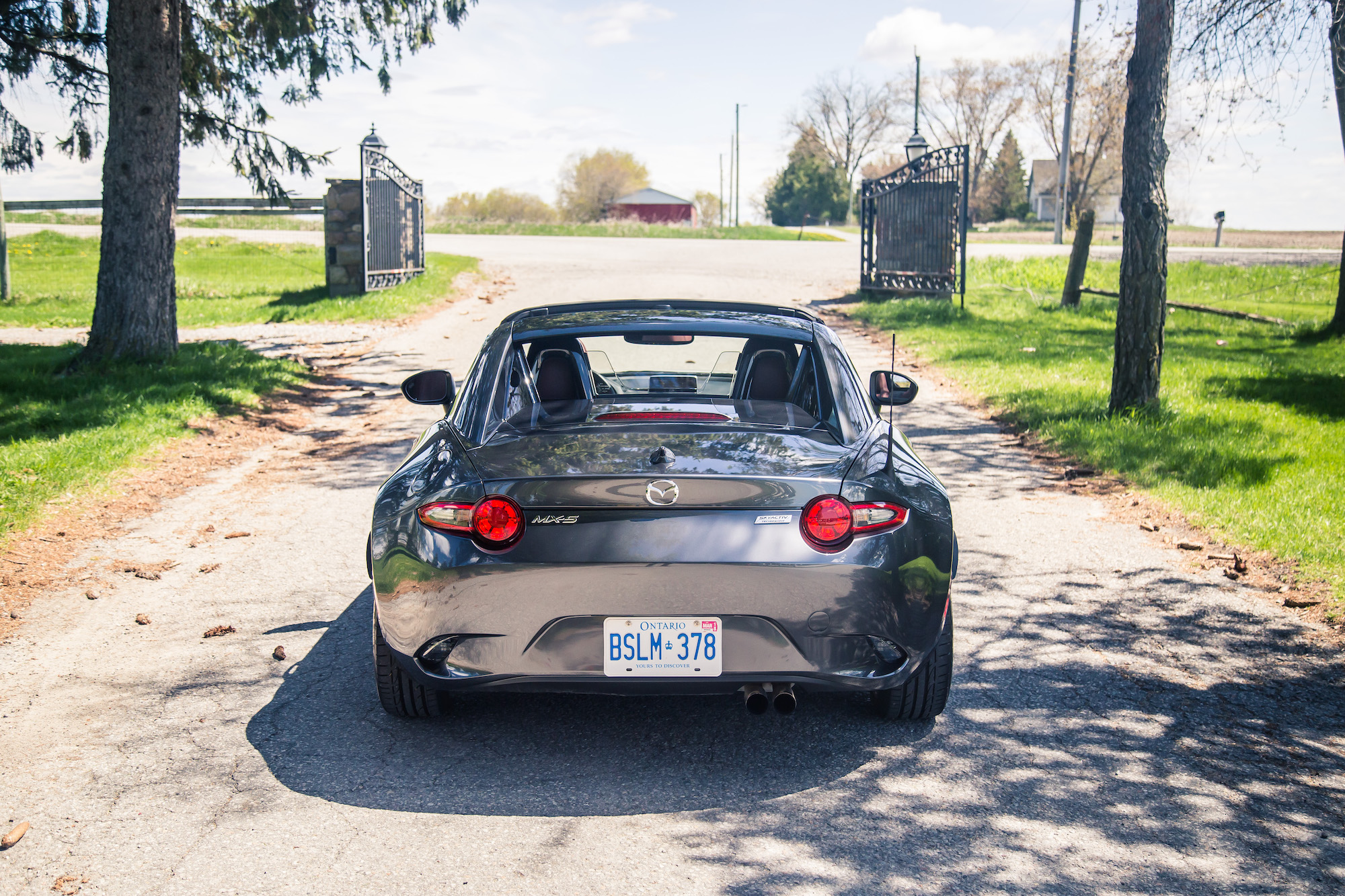 The rest of the MX-5 RF is standard soft-top fare, with the addition of a roof button in the center console, and a new Machine Gray colour (as you see in the photos) exclusive to the RF. Storage space in the back is identical, and the same engine lies under the hood as well; the 2.0-litre SKYACTIV naturally aspirated four-cylinder banging out 155 hp and 148 lb-ft.