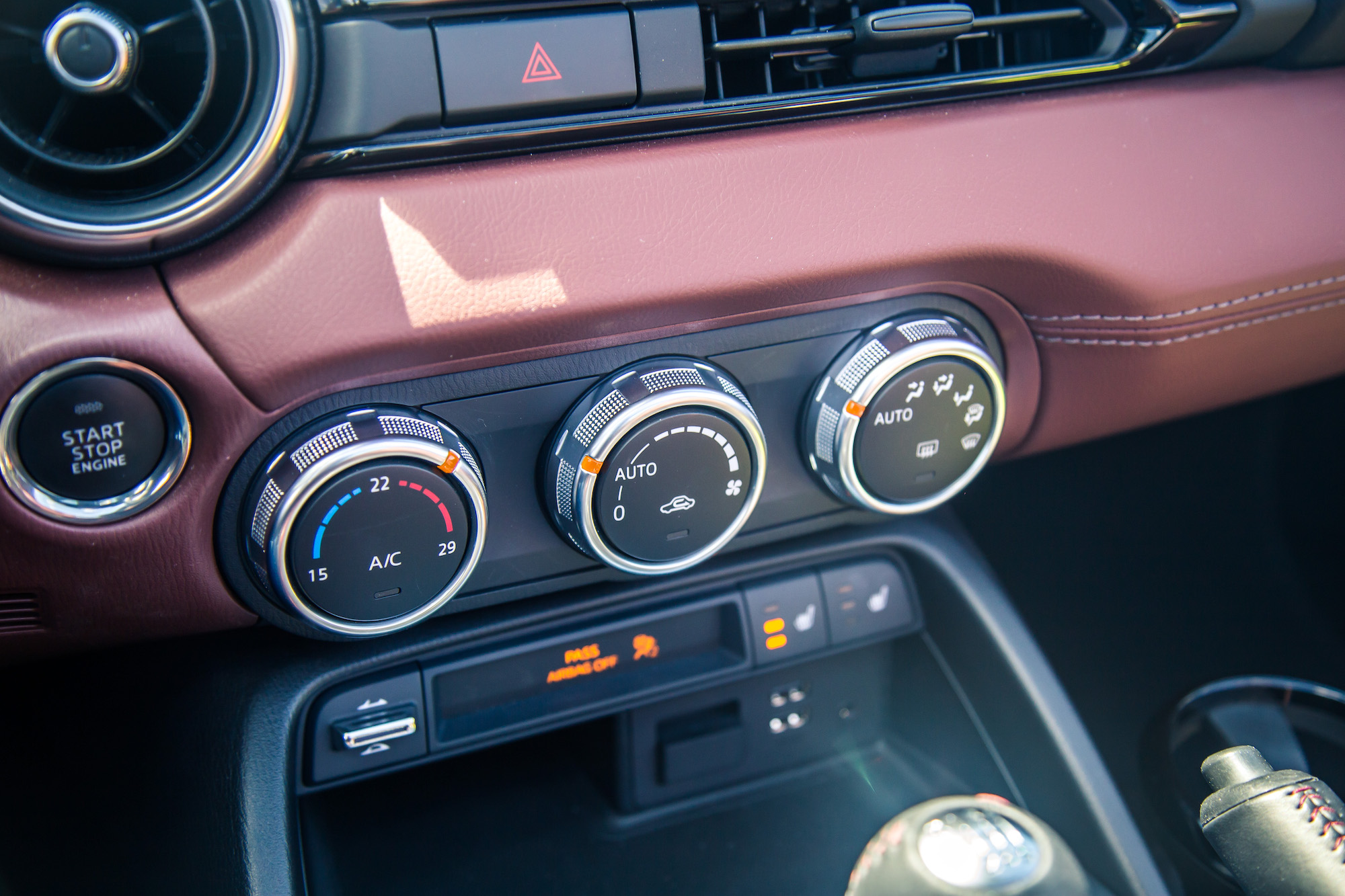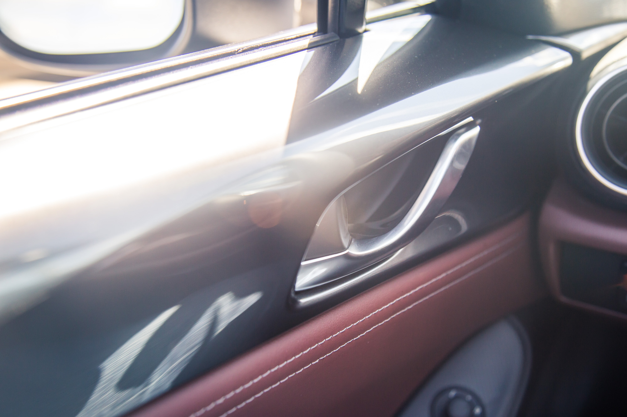 I love the interior too, which adds body-coloured panels throughout, giving it that extra bit of personal spice. Practical, though, this MX-5 is not. Significant storage bins are lacking, and there aren’t any side door pockets either. Got an iPhone6? Too bad, because it won’t fit anywhere except in the vertical storage bin between the seats.