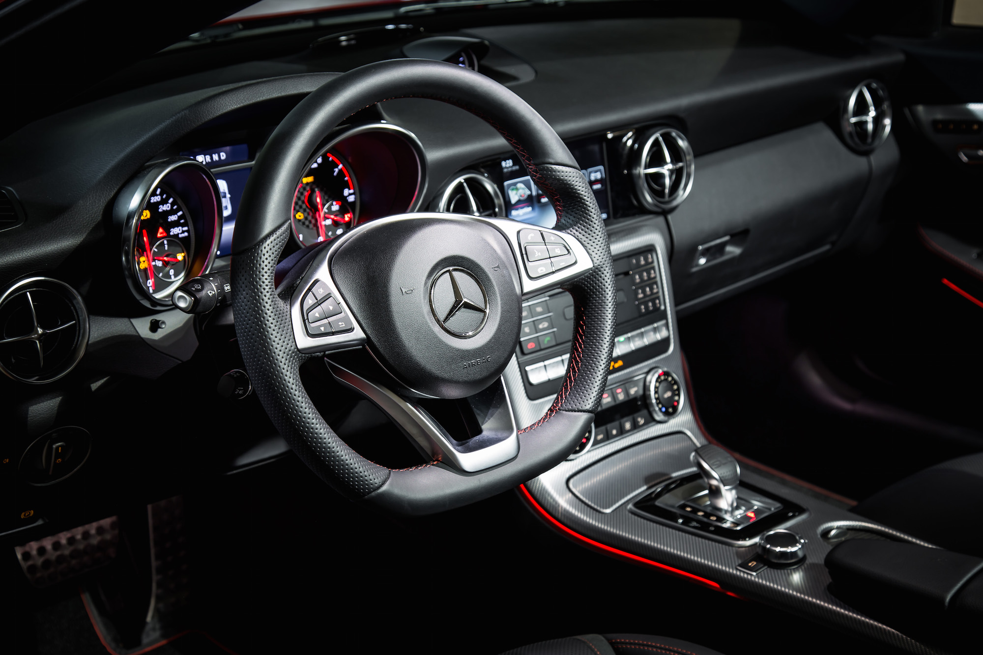 The renovated interior is a mixed bag of old and new. The SLC receives a revised steering wheel, which is chunky and concaved (we still like the old one better), but the center stack remains untouched – it’s still the logistical array of keyboard buttons, dials, and fans plucked straight out of the SLS AMG.