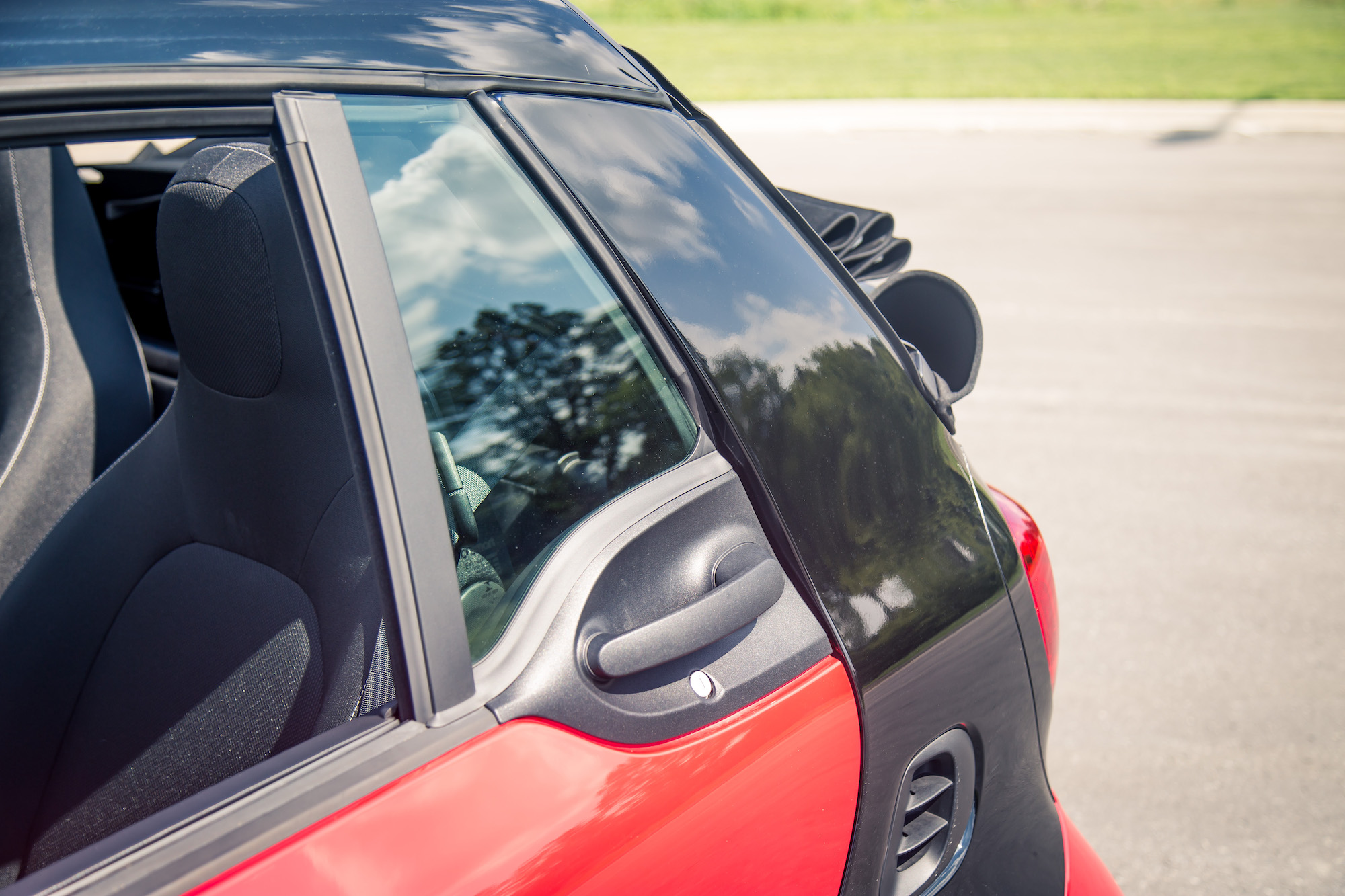 Contrary to popular belief, the smart’s interior is rather spacious. I stand six-feet tall and am able to find a comfortable and snug seating position with ample legroom and headroom to spare. I’d say it’s more comfortable than the horrid driving position in any of the Jeep Cherokees. You sit high up and that offers impressive outward visibility all around. When the roof is folded down, it does hinder the view out the rear, but it’s better than what the MINI Cooper Convertible offers. Wind buffeting isn’t amazing but with the windows up and the roof down, cabin noise is tolerable.