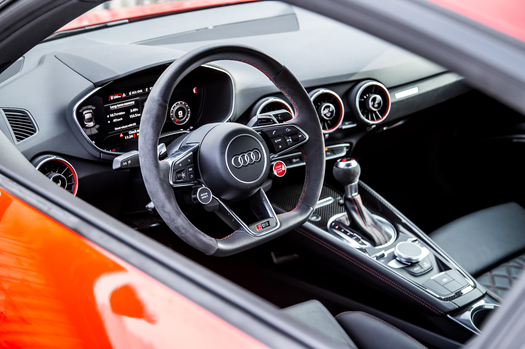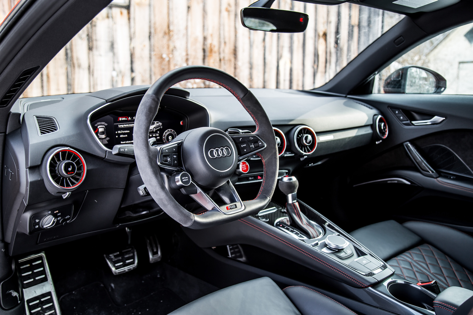 That being said, the TT RS does offer some eye-catching goodies, like the sleek 12.3-inch driver’s display, wheel-mounted start button in red, two-tone seatbelts, and a dedicated exhaust button. The R8-styled steering wheel remains the centerpiece, and is almost worth the money alone, wrapped in leather but with alcantara inserts on the 9- and 3-o’clock positions. It is much easier on the eyes than the wheels in the RS3 and RS5, and looks the part of a purpose-built speed machine.