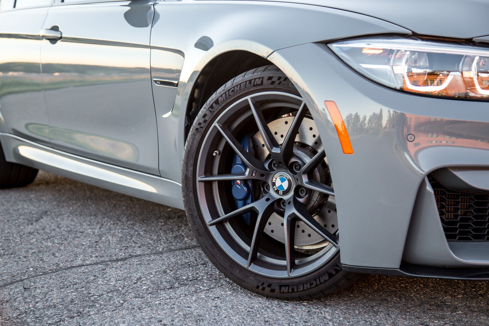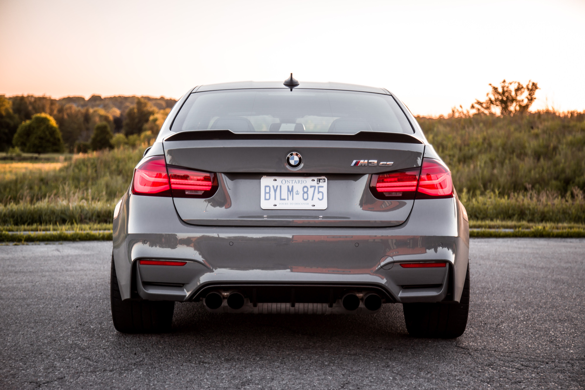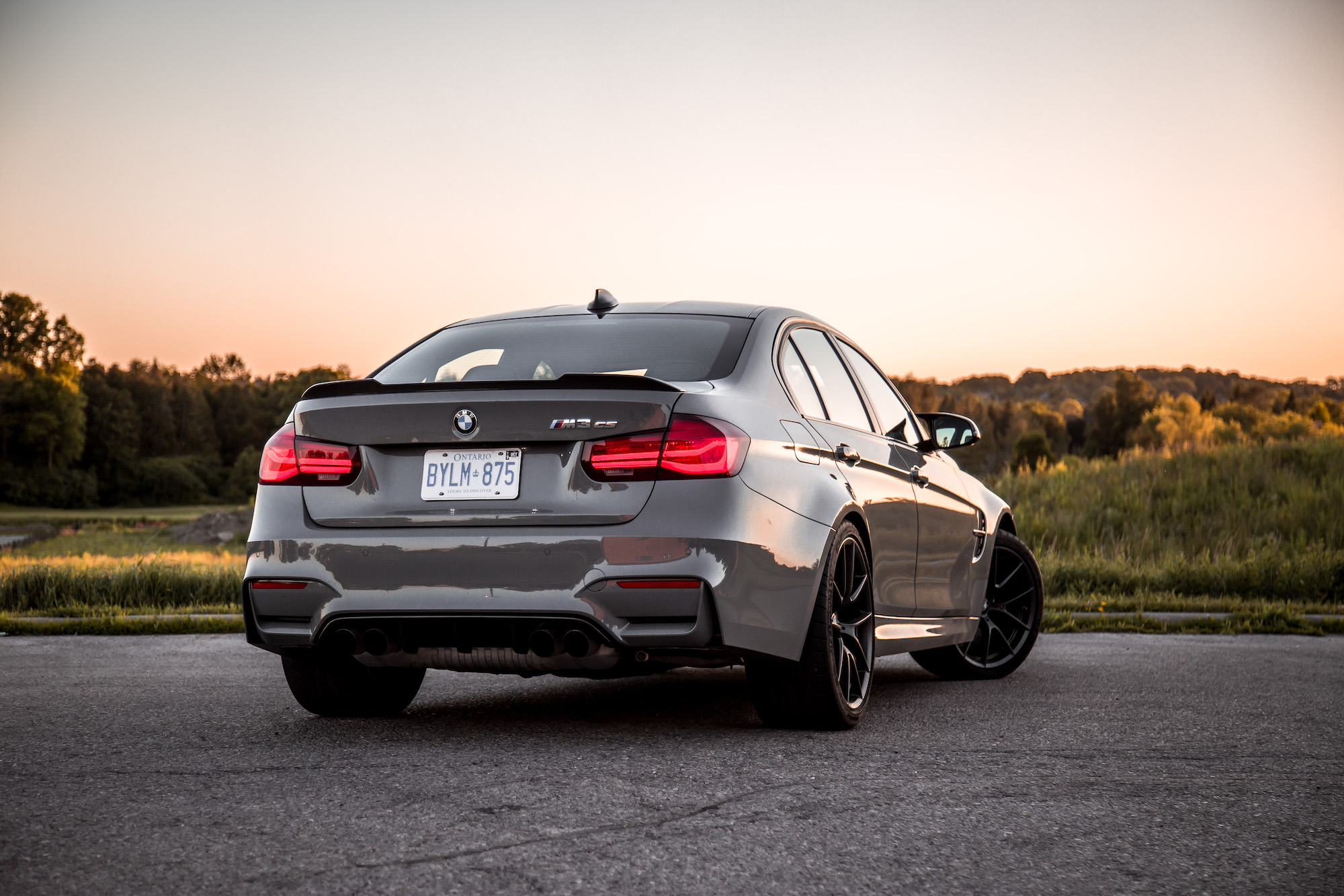 In CS tradition, the entire vehicle is put through a diet with an intensive use of carbon fibre reinforced plastic. The front hood itself is 25% lighter and the fixed carbon fibre roof saves another 6 kilograms while also lowering the center of gravity. But what the M3 loses it also gains in other areas with a carbon front splitter, lip spoiler, rear diffuser, newly developed ten-spoke alloy wheels inspired by the design of the BMW M4 DTM racing car, Michelin Pilot Sport Cup 2 tires, and some exclusive paint colours like the Lime Rock Grey in our photographs.