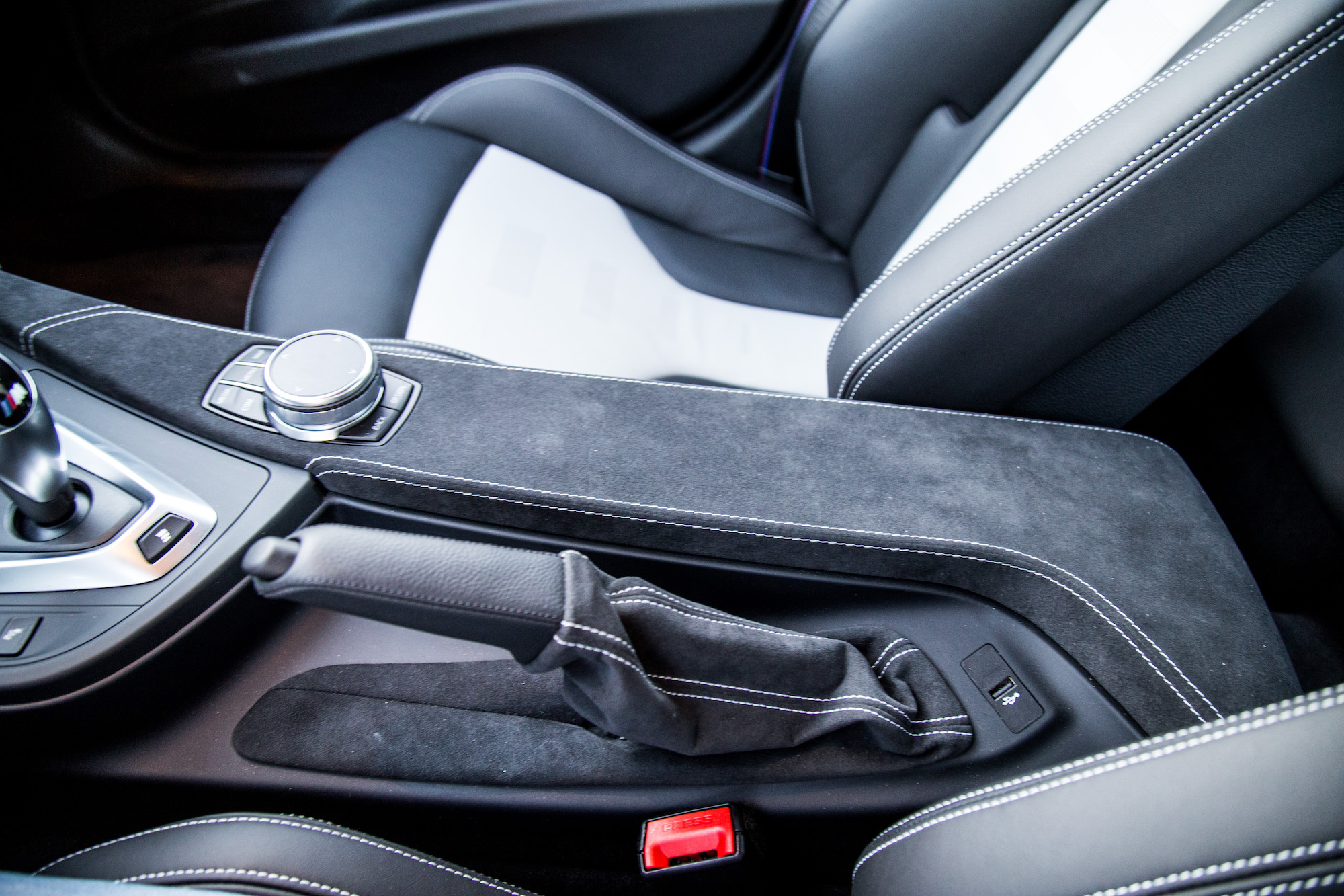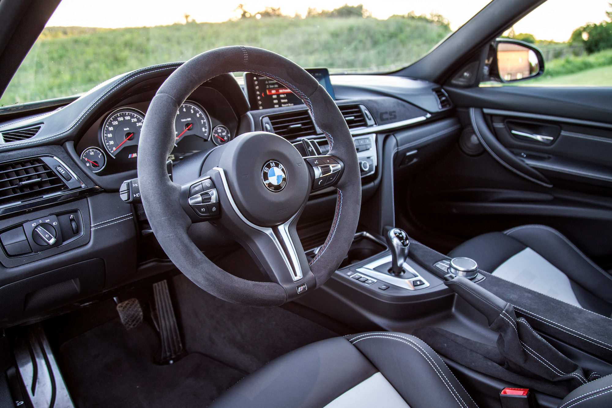 The interior gets spiced up with some CS specific adornments: the light gray and black dual-tone leather is exclusive here, storage cubbies in the center console are non-existent in the name of saving weight, but you do get one USB outlet. The M-coloured seatbelts are a nice touch too. There is Alcantara wrapped around the steering wheel ($900) and dashboard, and lightweight seats are taken from the Competition Package.