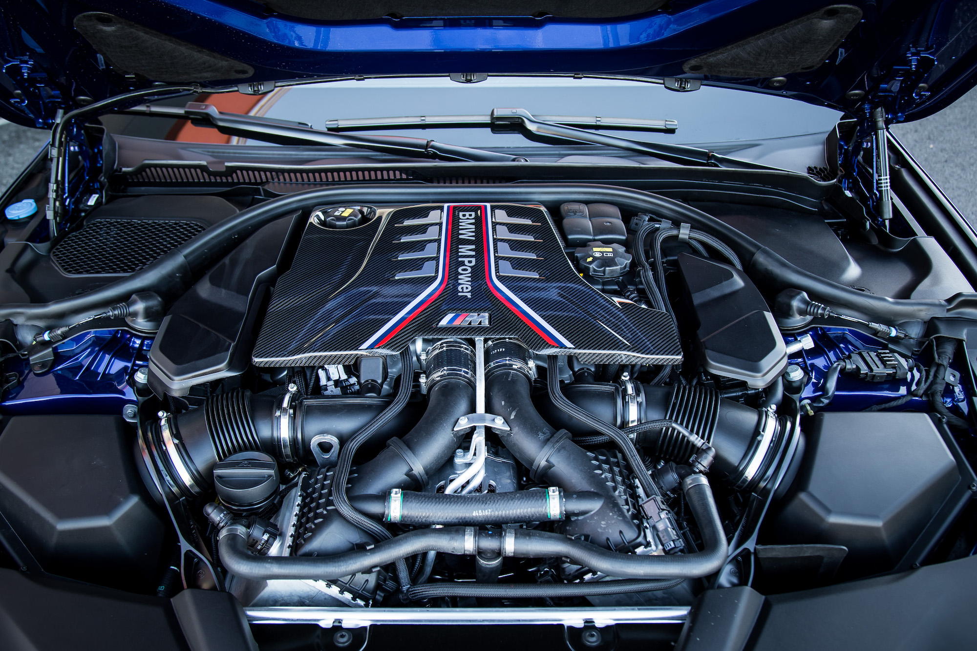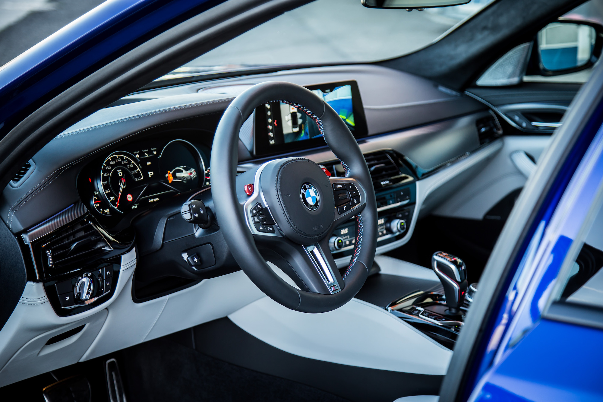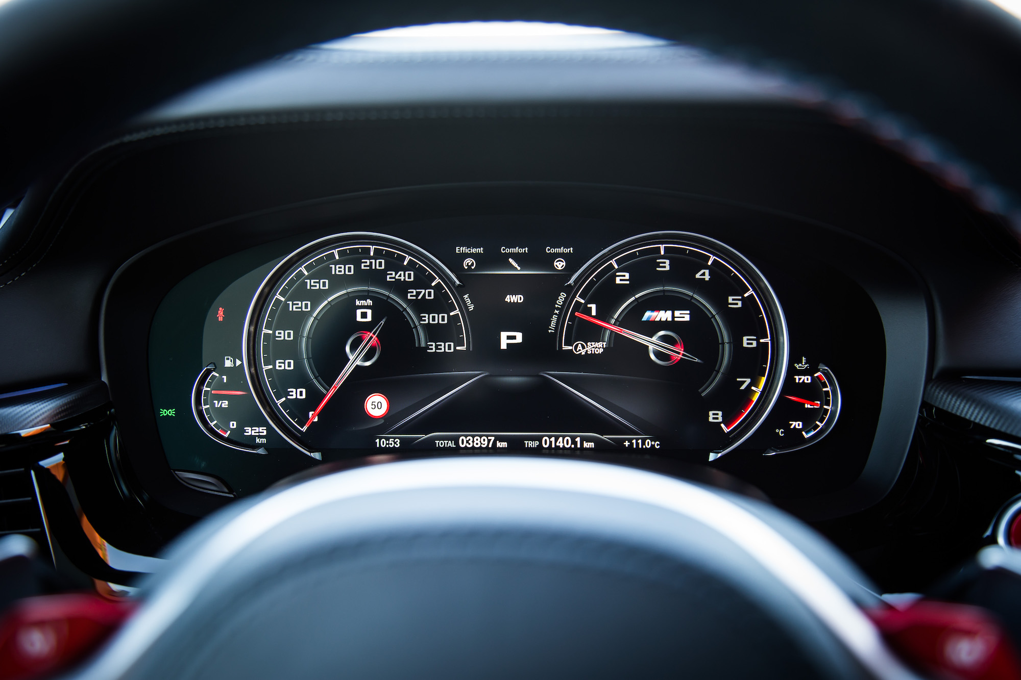 Other specific M5 features include a new digital instrument cluster, M head up display with a tachometer reading, a red engine start button, and red M buttons that flank the steering wheel, allowing the driver to program their desired settings for the engine response, suspension, and steering. The cabin is clearly not as clean-cut or as technologically vibrant as the rivaling Mercedes-AMG E 63 with its magnificent dual-screen setup and ambient lighting, but the M5 will be a familiar and warming atmosphere to previous and current BMW owners.