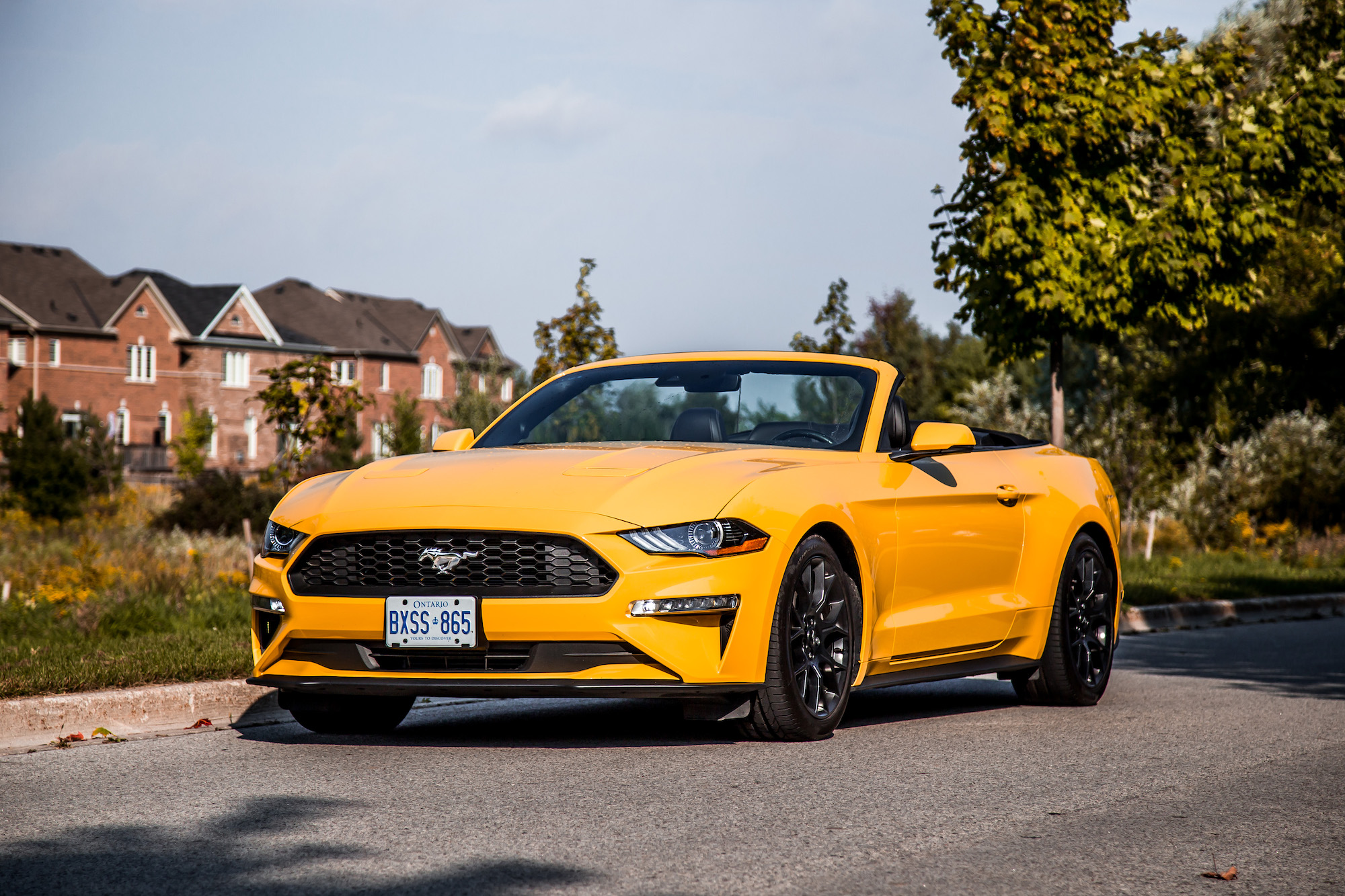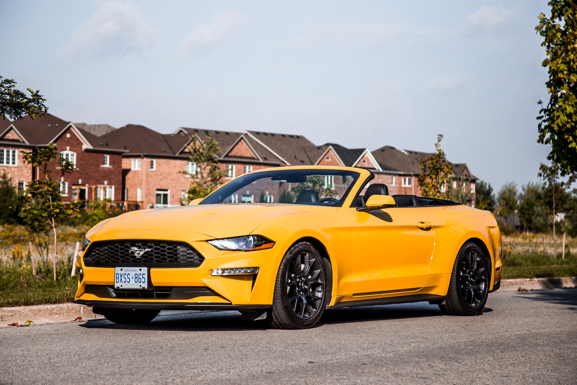 I recently drove the 2018 Ford Mustang GT with its reworked V8 engine and new exhaust system, and while it did sound incredible, and having a naturally aspirated motor in 2018 is a rarity, it lacked the driving dynamics and cornering abilities that I expected from a fully loaded $50,000 muscle car of its calibre. But now I’m testing the less powerful, less expensive, and less shouty looking Mustang Ecoboost Convertible – talk about inconspicuous in bright yellow – hoping that it will prove to be less of a handful and more of a straight shooter than its hormonal sibling. They told me I should have started with the EcoBoost and made my way up to the GT so I don’t get spoiled with V8 power but we don’t always get what we want. And to be frank, I think I prefer this Ecoboost engine anyways. It’s not trying as hard to prove itself in the field.