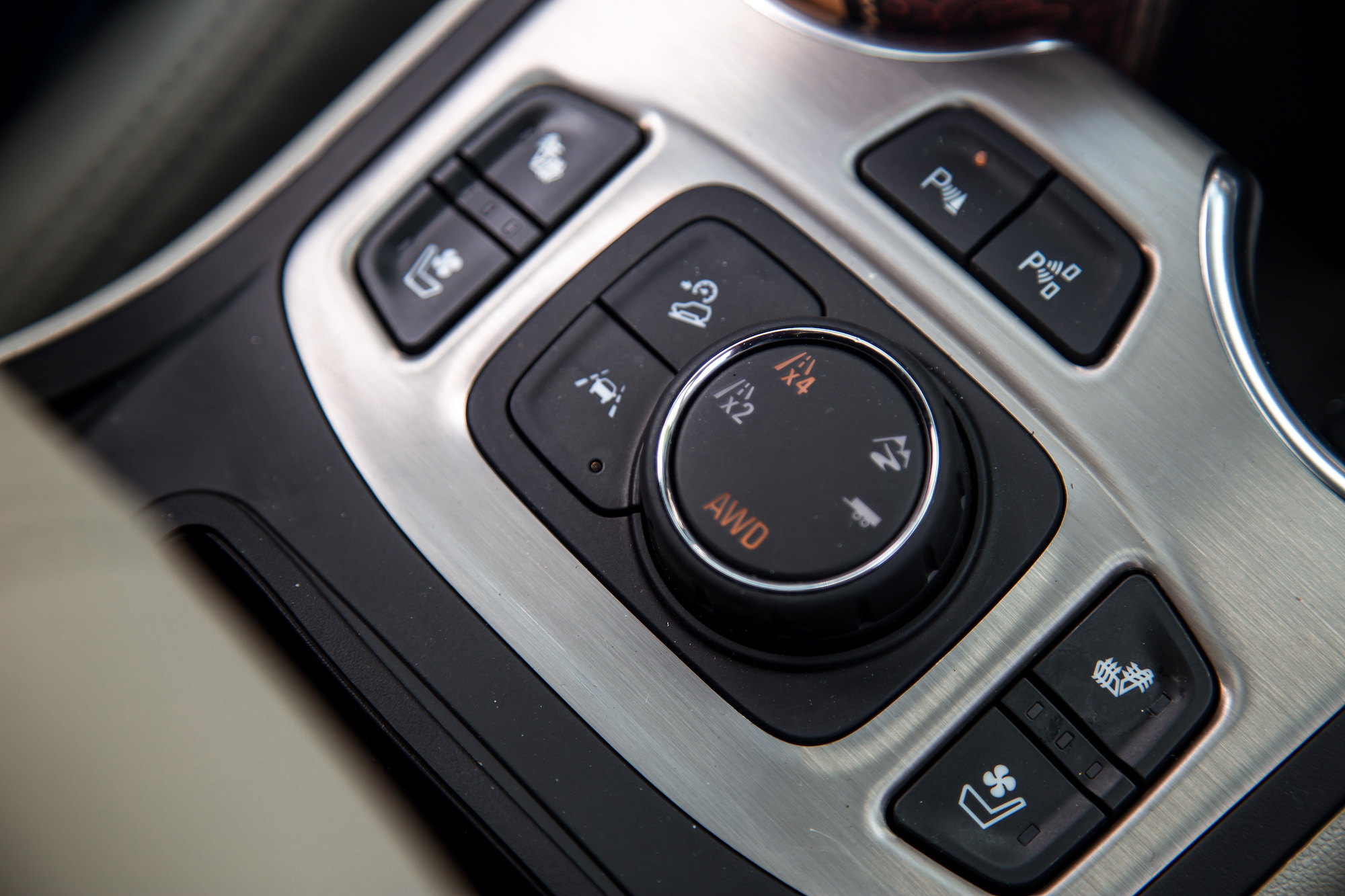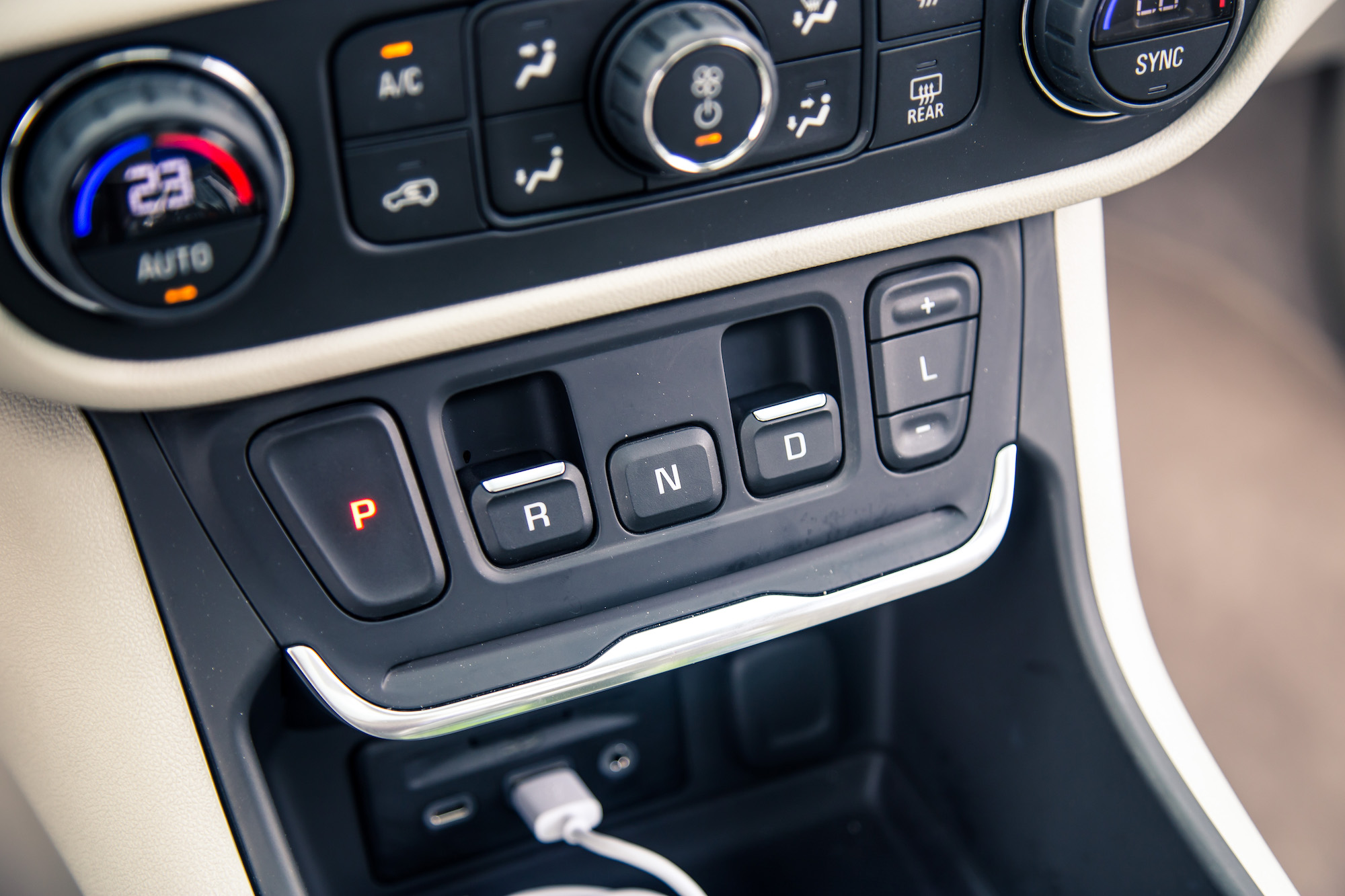 The interior has been given a significant refresh, most notably with the redesign of the gear shifter. Instead of a traditional lever, the Terrain has resorted to a push-pull-switch gear selector located underneath the fan controls. The “pull” buttons are for Reverse and Drive, and the “push” buttons are for Park, Neutral, and Low Range. The clever positioning of these buttons allow your index and middle finger to always fall into place of the “pull” buttons, so you’ll never get mixed up on which gear you’re choosing and lets you keep your eyes on the road. This also frees up a ton of real estate for bigger storage areas and a center pass through to the cubby underneath.