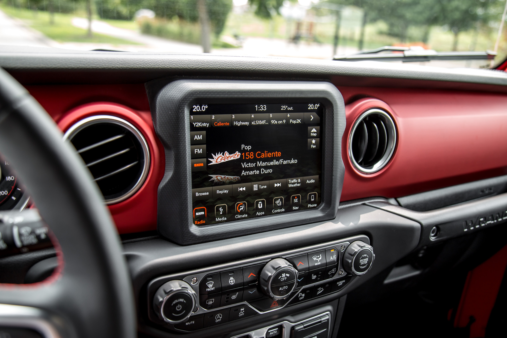 To add a bit of visual garnish, the locking differential switch panel has been highlighted in red, and the center cluster of buttons and knobs are symmetrically arranged. The Wrangler even comes with optional heated seats and steering wheel, which comes in handy when the doors are off and the air a bit chilly. To my amazement, the Wrangler interior is an easter egg explosion of Willys icons and silhouettes everywhere from the bottom of the windshield to the spokes of the rims, and even after a week with it, I still haven’t found them all. The Alpine audio system is decent, with an effective amount of bass that reaches all four corners of the cabin, even when the doors are off thanks to speakers on the center roof section.
