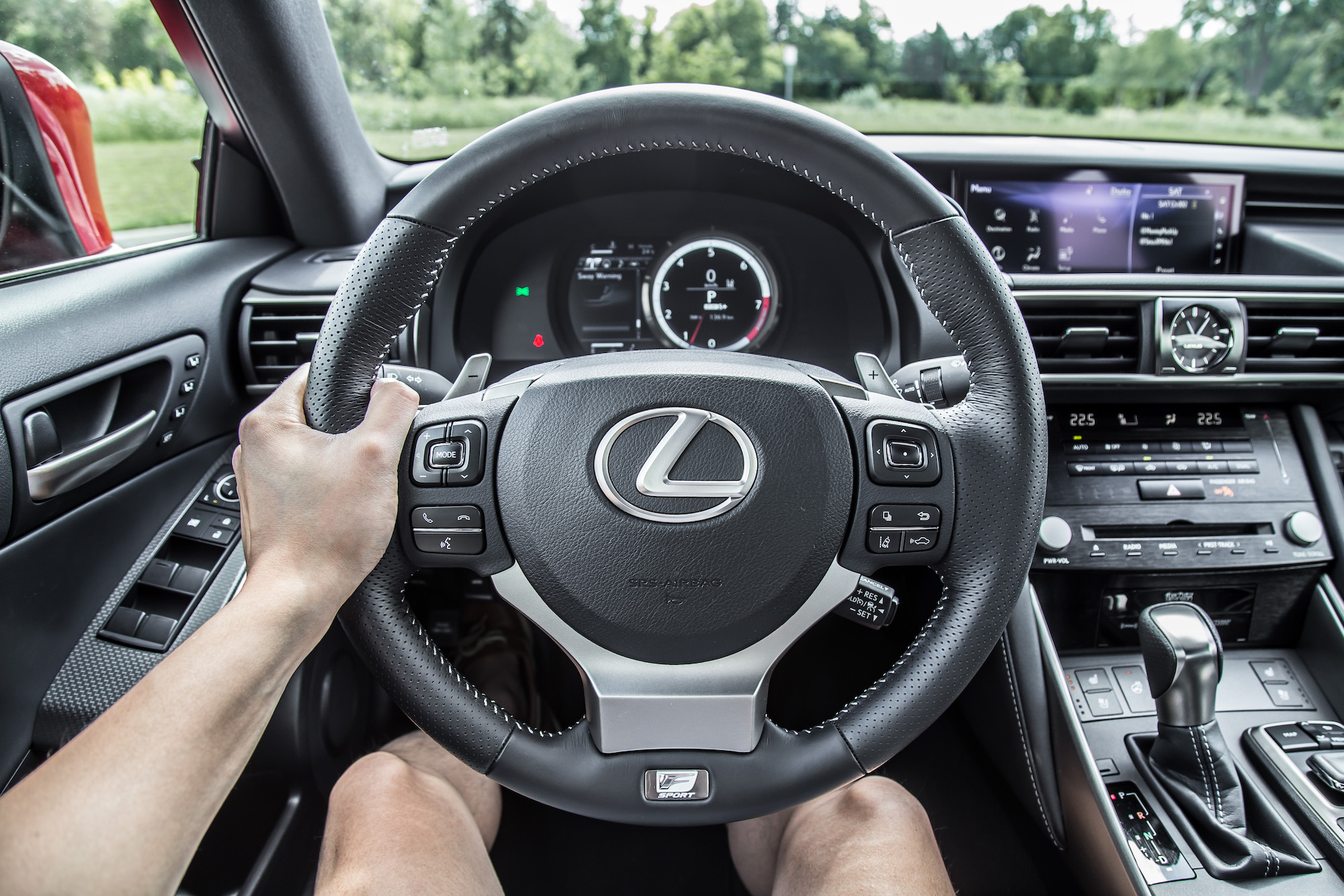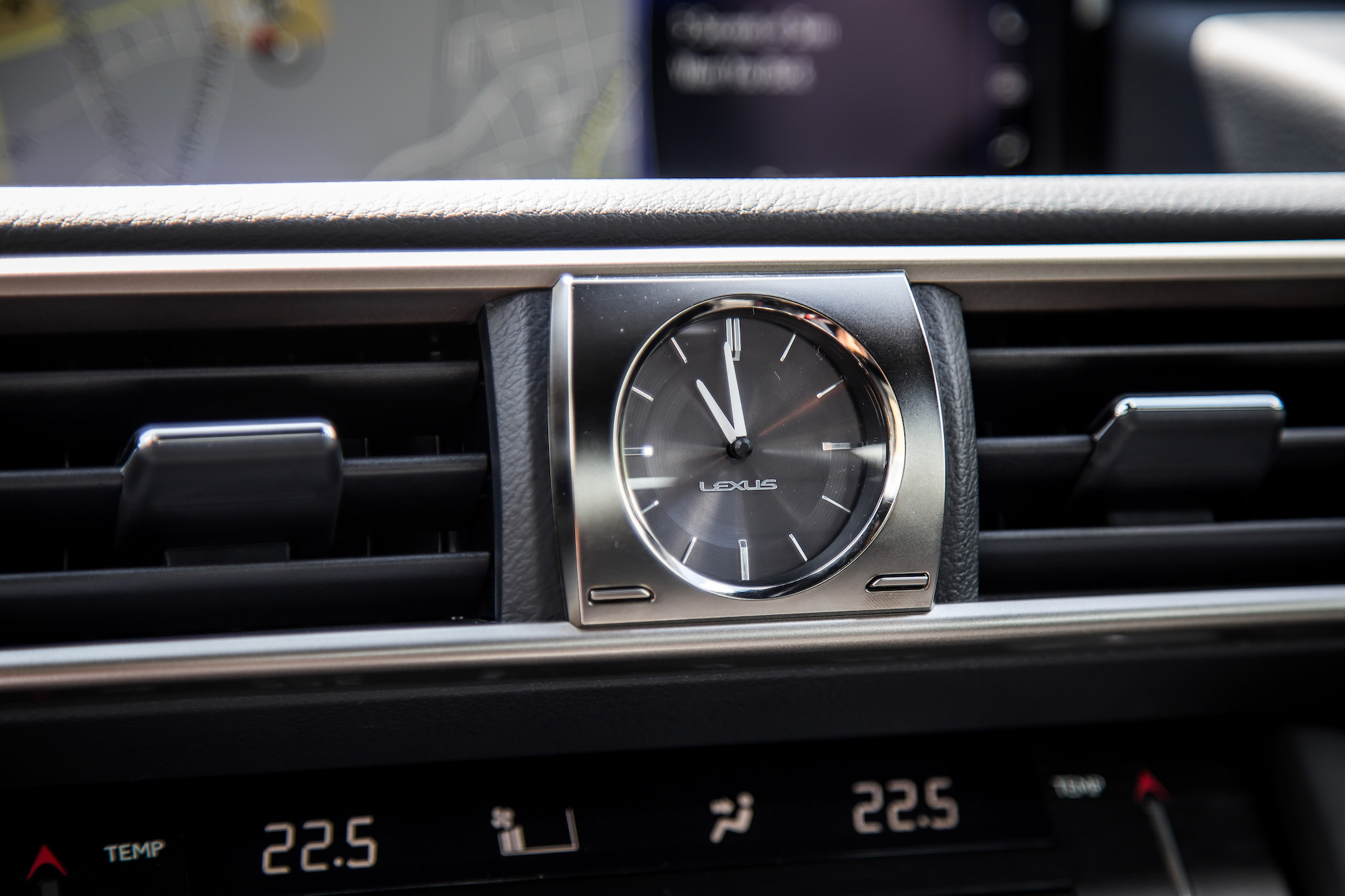 On the inside, the IS delivers a sweet cabin layout. We first drove this generation of IS back in 2014, and it still appears fresh and attractive today. The center console is button intensive but functional and sports large buttons for the heated wheel and seats. The volume and tuning dials are finished in a matte texture that feels incredibly expensive, but the touch-slider heating controls I can do without. They’re not the easiest to modulate with precision, and is more of a Hail Mary type of control with your fingers crossed that it hits that optimal 20.0 degrees. Love the analog clock and the soft leather wrap on the steering wheel, though.