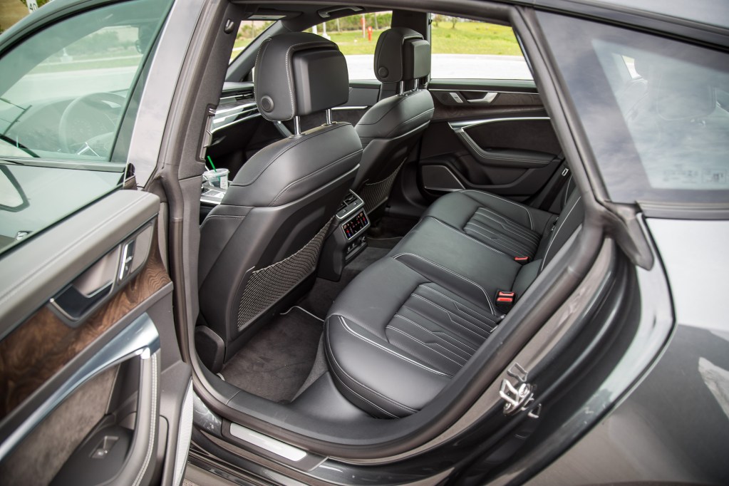 The new A7’s wheelbase has been stretched by 12 mm with most of that extension gifted to the rear seats, but head- and legroom is still an inherent issue for any averaged size adult. For reference, if I try to sit behind my six-foot self, my knees are forced to spread outside the front seat and I have to slouch my back considerably so my head doesn’t graze the headliner. If you plan on ferrying passengers on a regular basis, you may want to stick with the more sensible A6 but don’t be fooled into thinking the A7 is lacking in cargo space too. The area underneath the integrated liftgate is impressive, and the rear seats can be folded down for a passthrough to accommodate longer items. The A6 has minor advantages though, like an electric rear windshield shade, manual side sunshades, and more rear window clearance when rolled down (it’s limited to about half way in the A7).