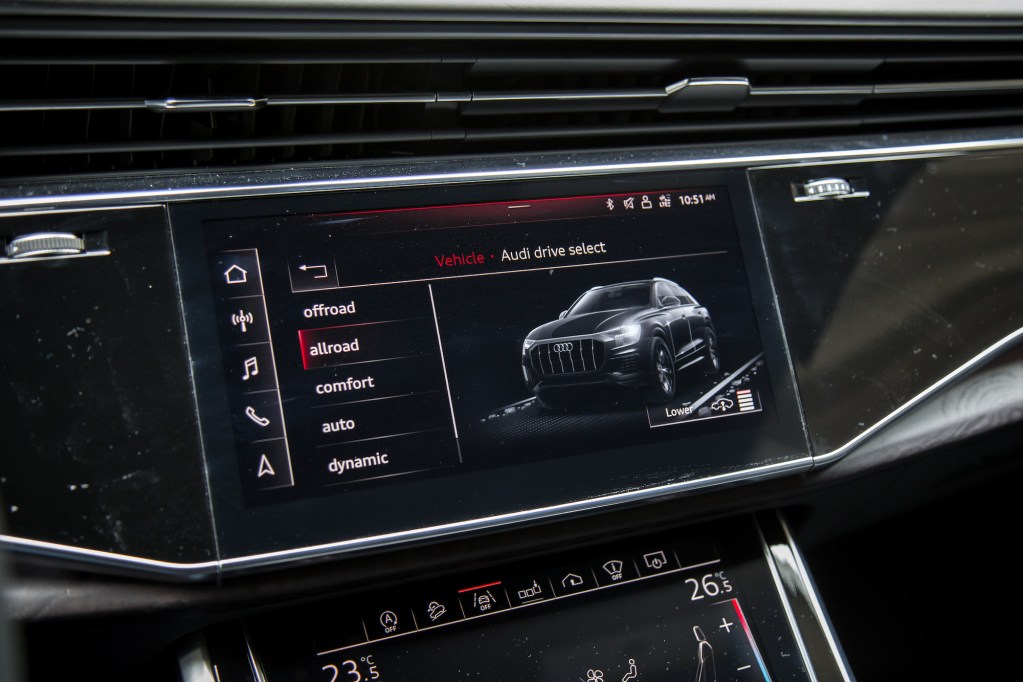 There is only one powertrain offered with the Q8: a 3.0-litre turbocharged V6 paired with a 48-volt mild hybrid system. Under the rear cargo floor is a 10 Ah lithium ion battery system that acts as the vehicle’s alternator and start/stop system, and while it does not add supplemental torque, it enables the engine to shut off for up to 40 seconds when coasting between 60 – 160 km/h, and ensures the start/stop transition to be nearly imperceptible. Audi suggests that it will save an average of 0.7 L/100km.
