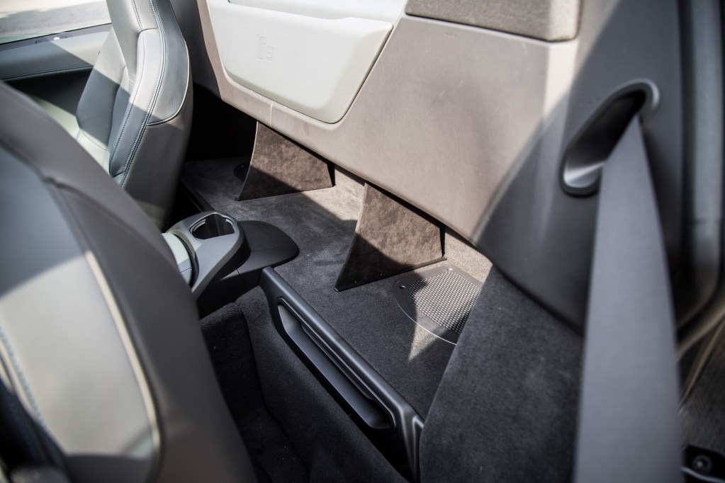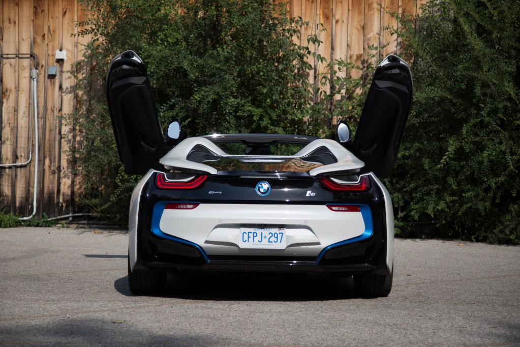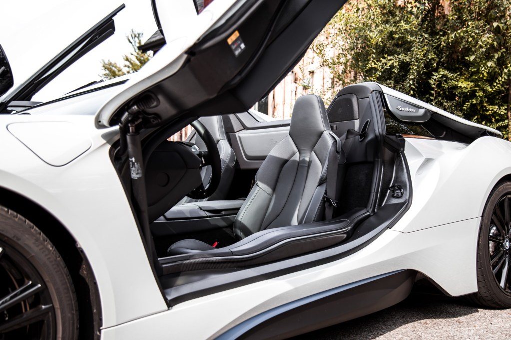 In Roadster guise, the i8 loses its two vestigial rear seats and gains some storage cubbies in its place. They are deep and compartmentalized, but there’s actually nothing in there to tie your items down or keep them in place. Loose items best stay up front, while larger bags can even go in the trunk – just don’t expect to fit as much back there as an Audi R8 or Acura NSX.