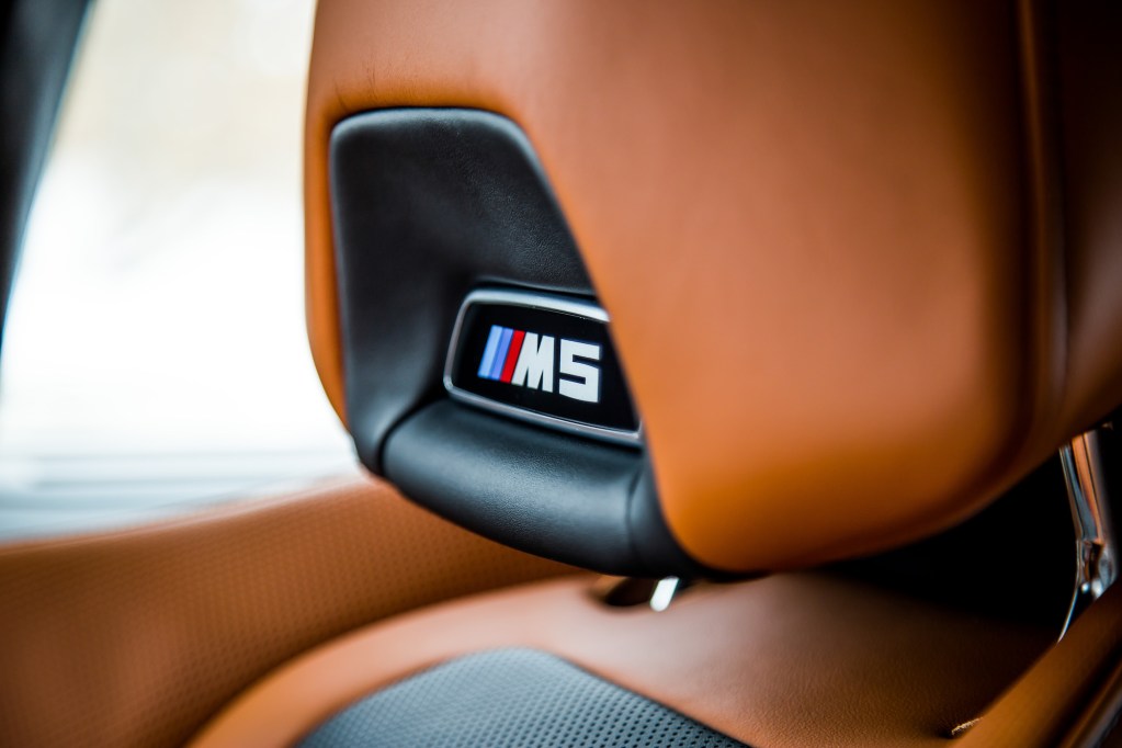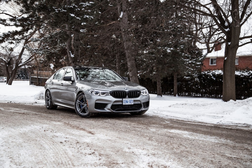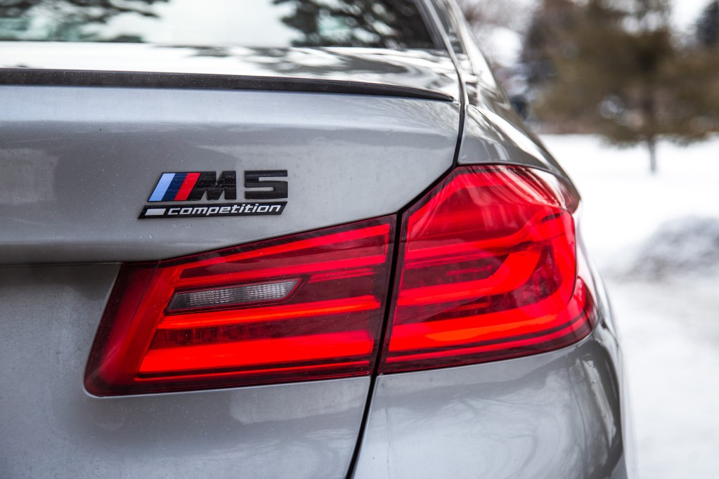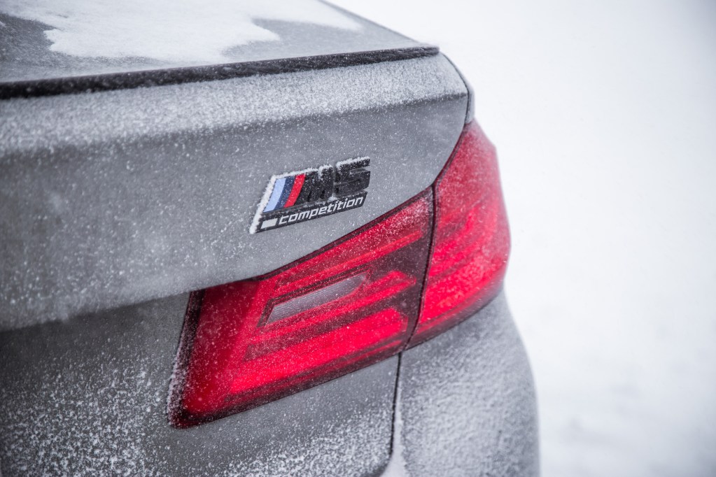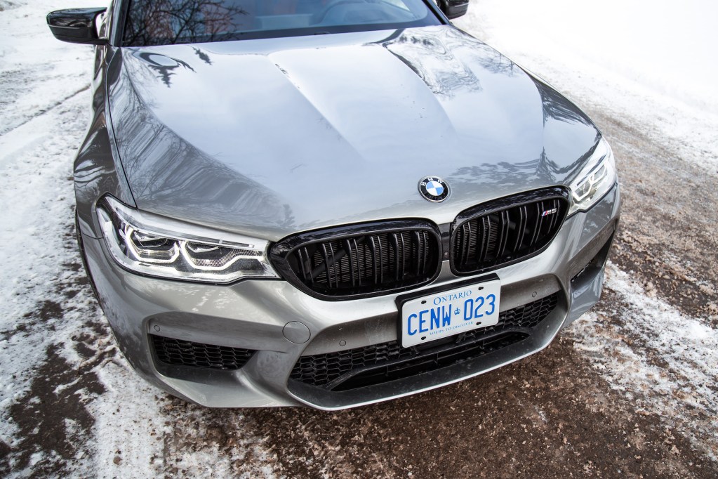 The Competition begins with aesthetic upgrades to set it apart from the basic M5, if you can even call a 600-hp sedan “basic”. The exterior receives high-gloss black finishes on the door handles, mirrors, front kidney grills, rear bumper, and rear spoiler. The cabin gets some updates too with M-coloured seat belts, floor mats, and a unique start-up graphic on the instrument cluster. Light-alloy 20-inch wheels grace all four corners but our specific tester was fitted with winter tires and a different set of rims borrowed the standard 5 Series, so excuse those in our photographs.