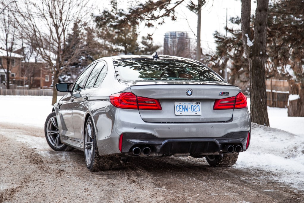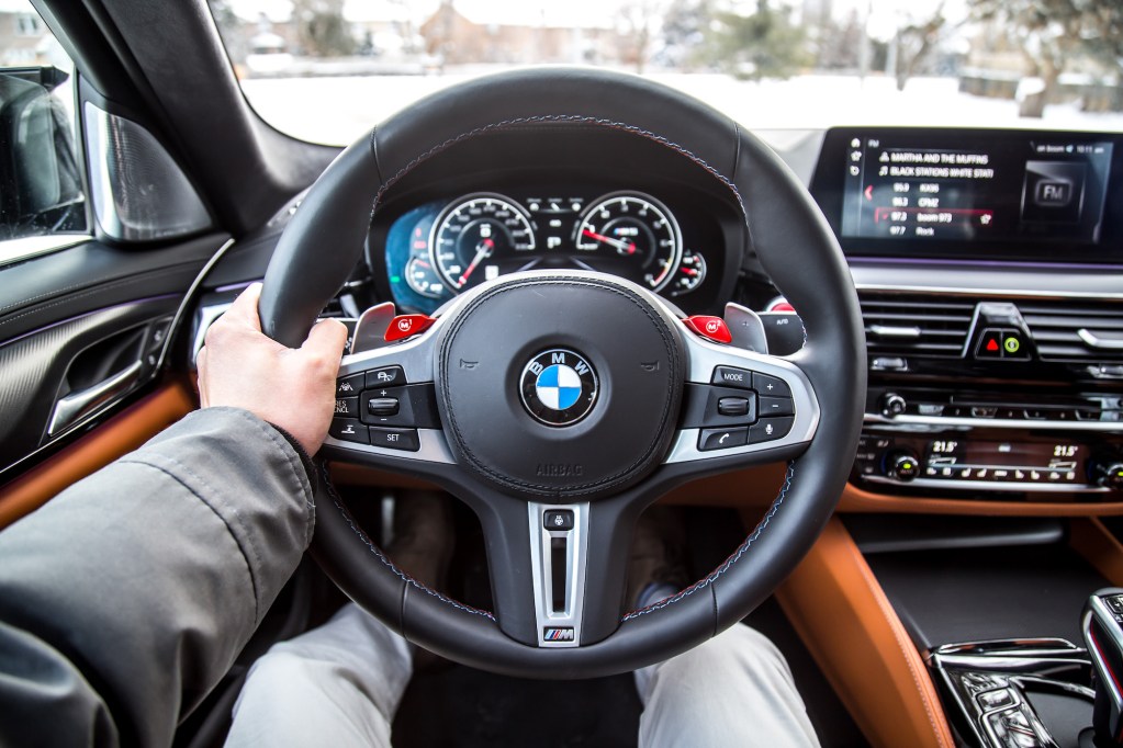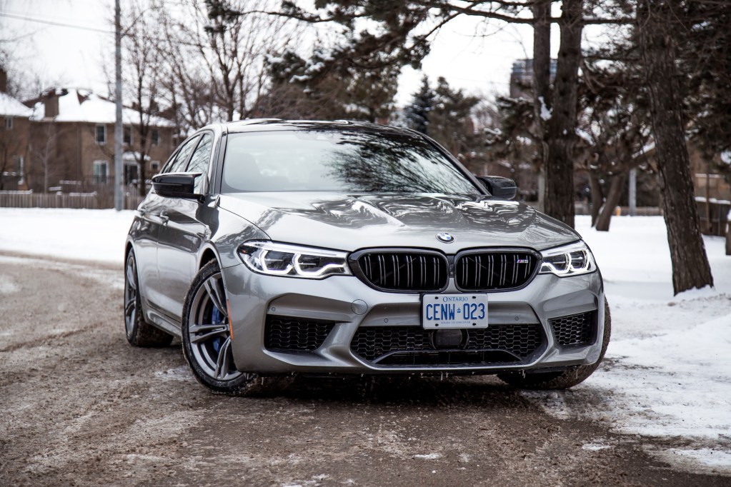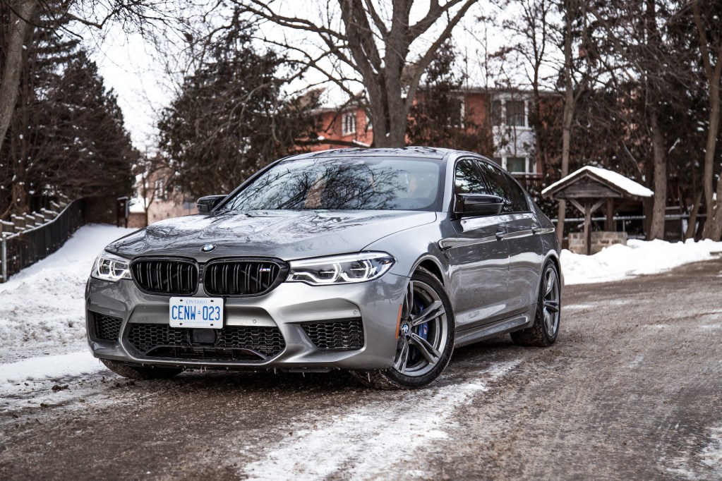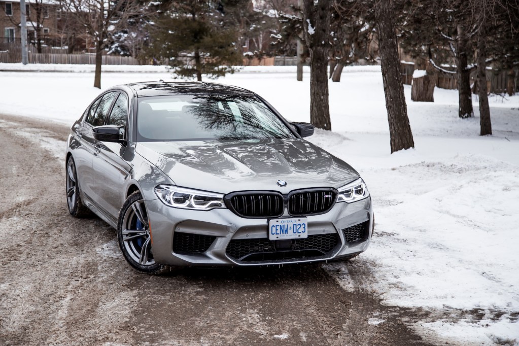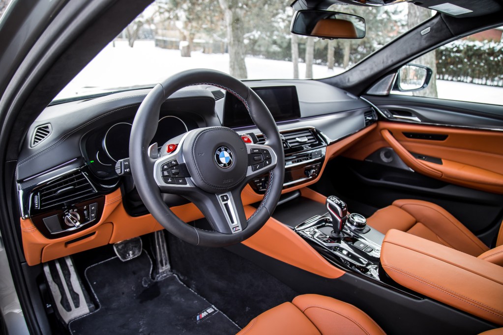 The Competition begins with aesthetic upgrades to set it apart from the basic M5, if you can even call a 600-hp sedan “basic”. The exterior receives high-gloss black finishes on the door handles, mirrors, front kidney grills, rear bumper, and rear spoiler. The cabin gets some updates too with M-coloured seat belts, floor mats, and a unique start-up graphic on the instrument cluster. Light-alloy 20-inch wheels grace all four corners but our specific tester was fitted with winter tires and a different set of rims borrowed the standard 5 Series, so excuse those in our photographs.