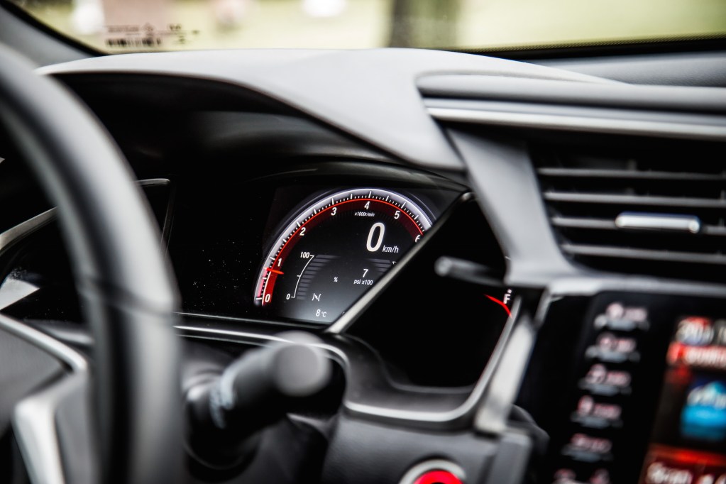 The interior is quite the opposite. Bland and uninspiring, Honda didn’t do much to spruce up the cabin other than adding sportier front seats, red stitching, aluminum sport pedals, red lighting around the gauges, a leather shift boot, and an aluminum shift knob. The scratchy fabric they use to cover the armrest and door lining was rough enough to earn some complaints from our passengers. You’re also not fooling anyone with those fake carbon fibre panels on the dashboard.