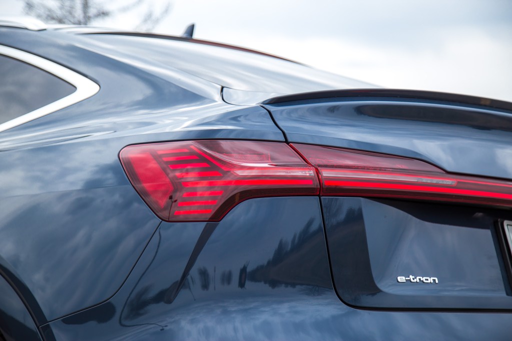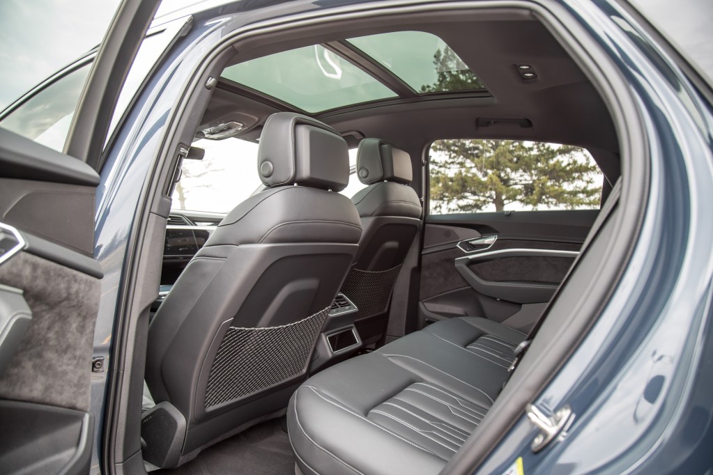 Seat comfort is above par with a great range of adjustment, wide shoulder and lumbar supports, and the rear seats are not penalized by the sloping roofline. In fact, my six-foot figure can sit behind myself with generous room to spare. In addition to the extensive sunroof, outward sightlines are excellent, the raised seating position means you sit around the level of an Audi Q3, and though trunk space is less than the regular e-tron, it’s more than usable. We’re just not sure if equipping a spare tire underneath the trunk bed was a bright idea, as the precious real estate could have been better utilized. There is some storage area underneath the front hood where a combustion engine would normally sit and even though it’s somewhat shallow, there’s enough room to store all of the e-tron’s charging paraphernalia.