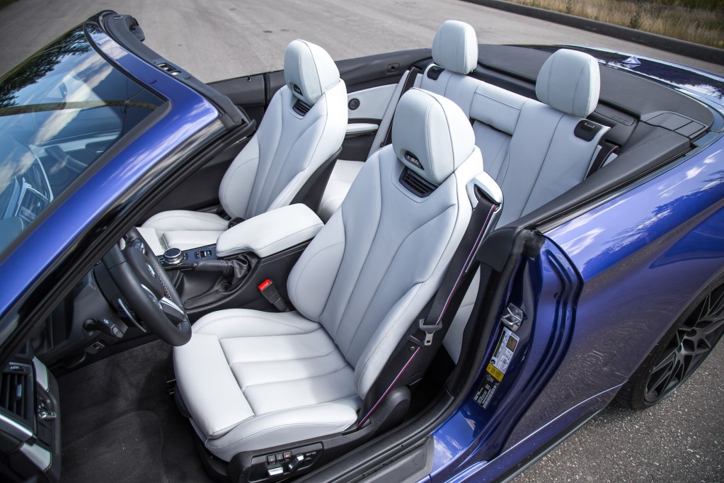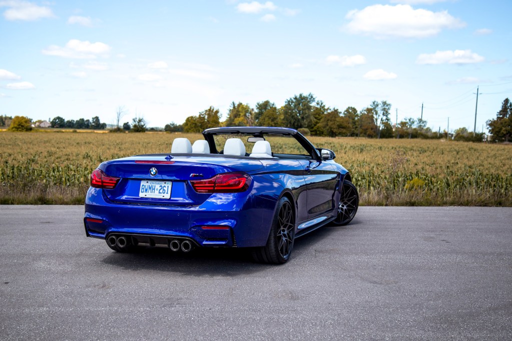 The driving position is excellent: not too low but not so high that you feel like you’re piloting an SUV. The steering wheel is thickly padded, and has a wide telescoping range to fit any driver’s preference. Visibility is a given plus with the roof retracted but even when it’s up, there are no B-pillars getting in the way of blind spots, adding to the cabin’s open and welcoming atmosphere. It’s hard to argue against that drool worthy Silverstone Merino leather either. But you will want to keep that roof down. The biggest advantage with a convertible is receiving unfiltered exhaust sound waves, unmarred by the metallic, leather, and glass sound filters that come with a fixed roof. You see, the standard M4 sounds brilliant by itself: tinny, mechanical, raspy, and high-pitched. But with the Competition’s new titanium exhaust, its vocals have reached the stratosphere, wailing to 7,500 rpm in a siren song of pops, bangs, and banshee-screeches. And without a roof getting in the way, you have front row seats to one of the most spectacular BMW symphonies around. Have a listen to our Exhaust Notes video above to hear it for yourself. Now, I will admit that the noise is a bit much at times, especially during cold starts and when the exhaust spits out AK-47 gunfire every time you lift off the throttle. Just be careful running through a tunnel, the sharp piercing notes are enough to rupture an eardrum.