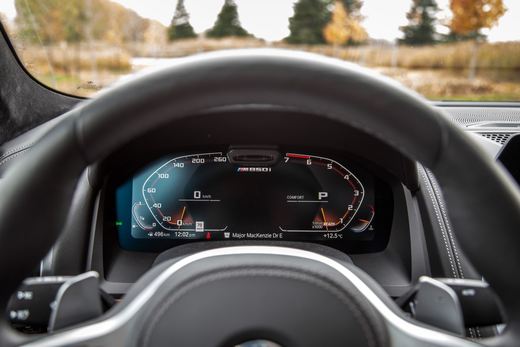 Aside from the upcoming hardcore M8, the Gran Coupe is only available in one spec, the M850i xDrive. Other markets will receive an inline-six-powered 840i but it was apparently never a popular option for Canadians, so they axed it. The M850i receives a 4.4-litre twin-turbo V8 producing 523 hp and 553 lb-ft. An 8-speed ZF-sourced automatic transmission sends power to all four wheels, but the most amazing feat about this powertrain is how the V8 produces peak torque right at 1,800 rpm, so you can ride that boost all day long until plateauing at 4,600 rpm, covering the area that drivers spend the majority of their time. And while we have seen 4.4-litres of displacement before from BMW’s V8 engines, engineers have promised this unit has been redesigned and improved in a multitude of ways, addressing prior cooling concerns and reliability issues. As such, the dual twin-scroll turbochargers are still located within the V-shaped space of the cylinder banks, along with variable camshaft timing and variable valve control.