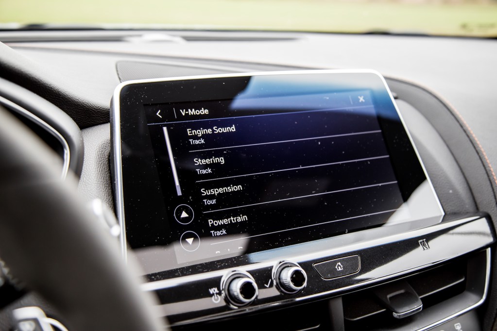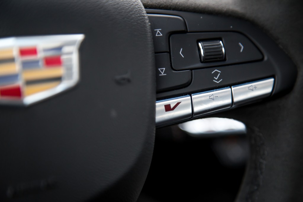 When the road becomes serpentine, Cadillac has installed a convenient V button within thumb’s reach on the steering wheel. Like BMW’s red M buttons, this conjures up a customizable mode for you to map your engine response, gearbox calibration, suspension setting, steering effort, and exhaust noise. Of course, ours was set to the full extreme, so whenever we pushed the V button, the V6 would wake from its slumber, the ride would stiffen up, and the exhaust would snarl to life.