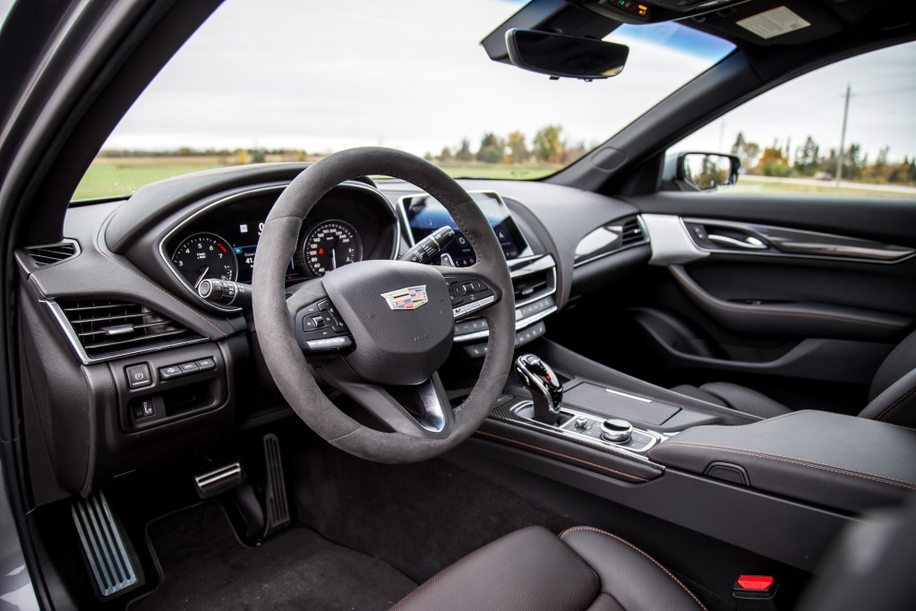 The 10-speed gearbox is a welcome companion and was actually co-developed with Ford. Quick to shift and smooth in transitions, the 10-speed is well-matched to the high-torque V6. Taking control via the paddle shifters does expose some rougher edges, as it lacks the lightning pace of an 8-speed ZF or dual-clutch. The shifts could be crispier but it’s still quick enough to keep up on spirited runs. And despite ten gears to row through, the CT5-V AWD is not the most fuel-efficient performance sedan we’ve tested. In city driving alone, we averaged a measly 14.3 L/100km.