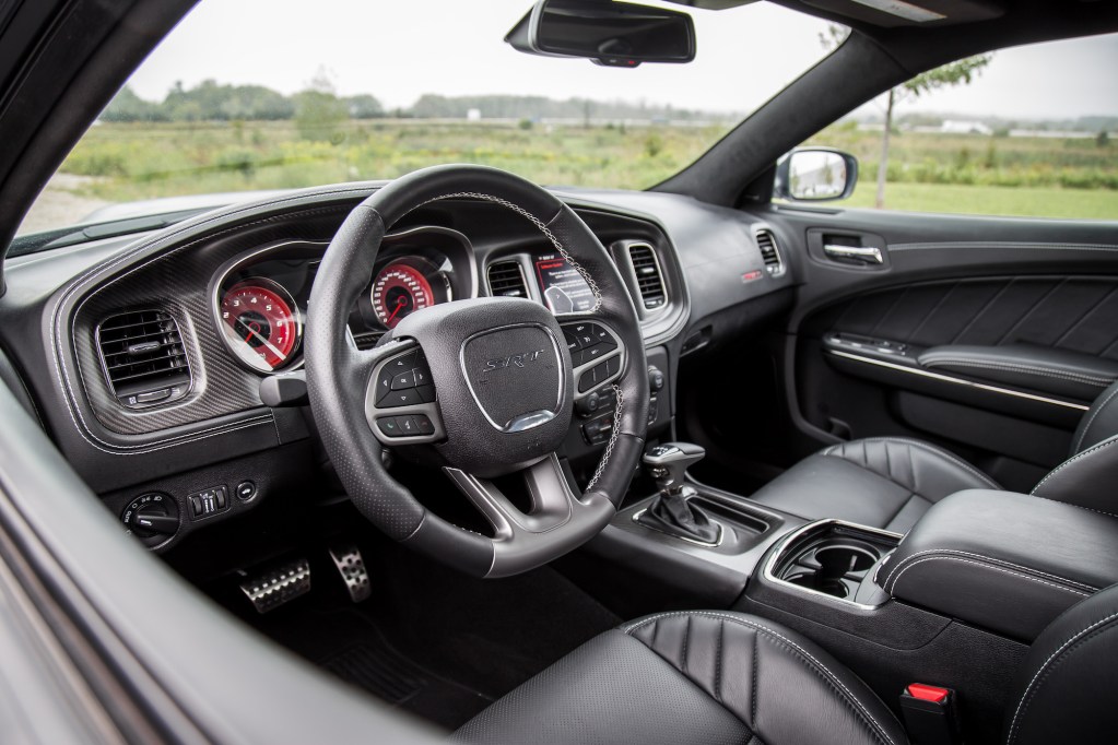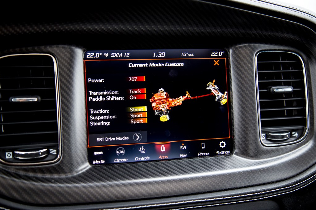 Inside is where you are clearly reminded that the Hellcat comes from humble beginnings. With an almost impossibly large cabin, seats as large and cozy as your living room recliner, and plastic parts galore, the Charger Hellcat Widebody remains as friendly and welcoming as your Hertz rental special. Plastic instead of metal. Plastic instead of leather. And if you thought BMW wheels were overly thick, the Charger’s is even thicker. Those with small hands might have difficulty finding a decent grip and wrestling the wheel properly at speed. Which is not to say the Hellcat is void of any cabin pizzazz. The SRT badge on the airbag cover lights up at night, and there are a flurry of performance menus and screens for the avid dragster to dig into and customize the launch rpm, the choice of 500 or 707 horsepower, steering and suspension tune, and gearbox intensity.