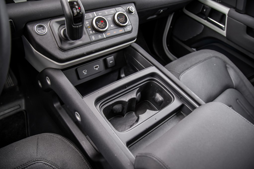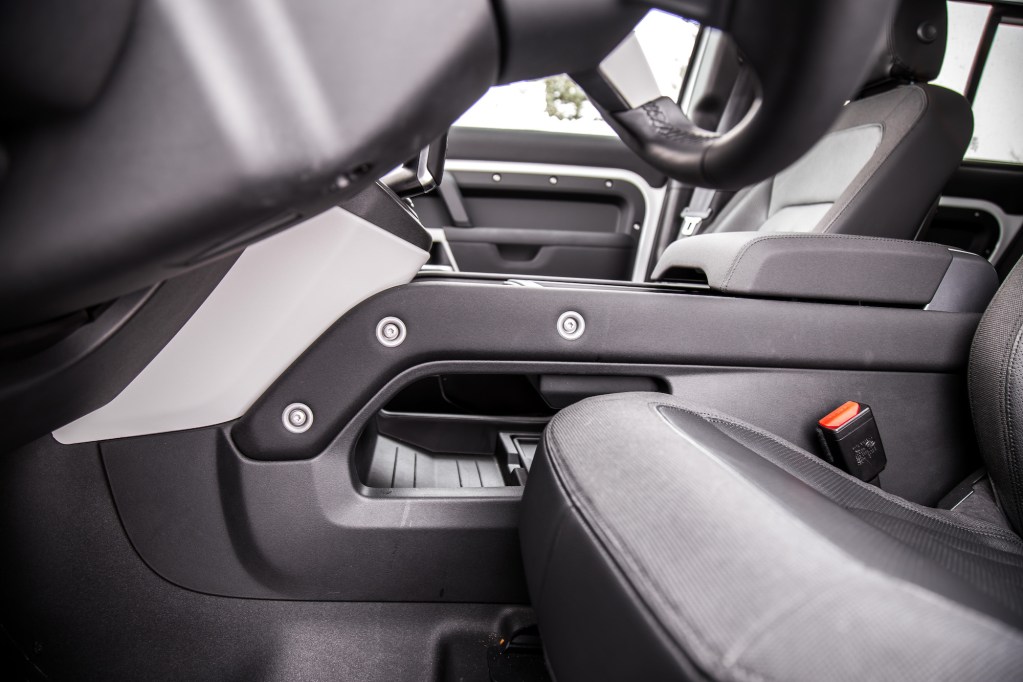 There’s certainly more pomp and circumstance inside the Defender than any Jeep or Toyota could hope for. The way the shifter and HVAC controls are mounted on an angle below the dashboard remind me of the Fiat 500 and ergonomically, it works well. A magnesium alloy beam runs the width, accentuating the interior’s expansive borders, and the cleverly integrated grab handles make for a streamlined look. There’s inherent sensibility in this design, and the recessed dashboard creates a wide array of storage options. They have also cleverly brought some of that ruggedness inside with the exposed screws, powder-coated ceramic-like surfaces, and the car’s paint showing through on the inside door panels, just like how Wranglers (and Mazda Miatas!) do it.