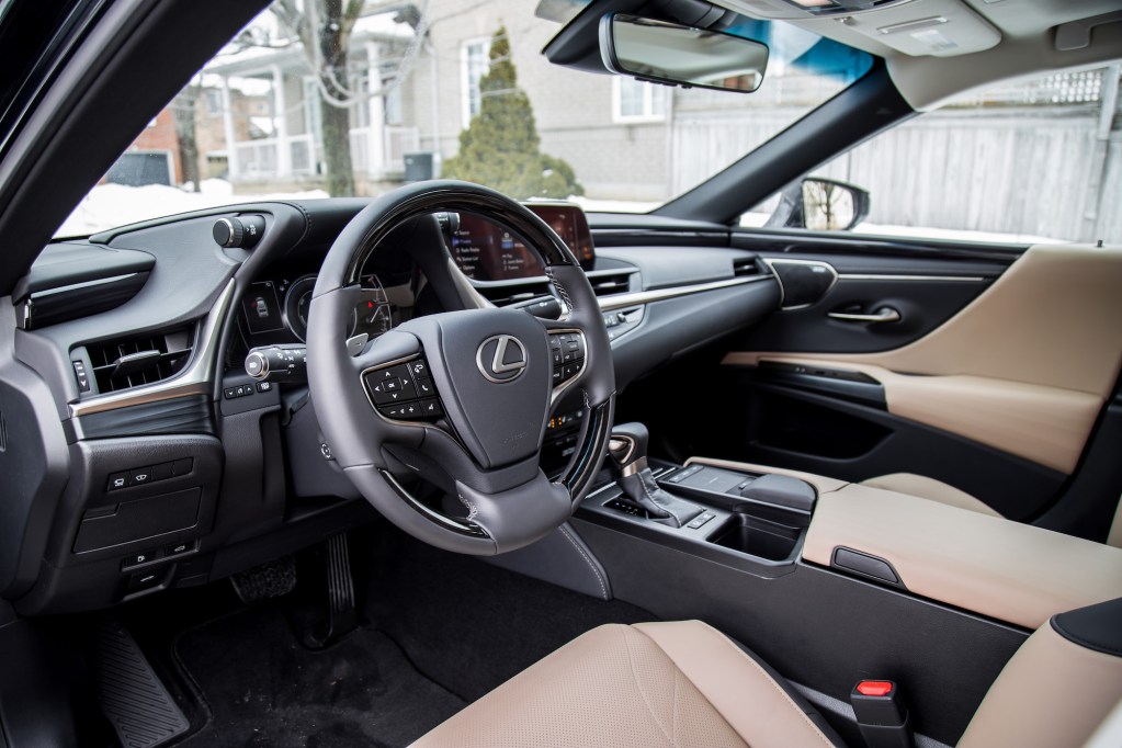 The ES offers two flavours of powertrains: the ES 350 with a 302-hp 3.5-litre V6, and the hybrid in question, the ES 300h, that utilizes a 2.5-litre four-cylinder mated to an electric motor and battery, and produces 215 net horsepower. This is a similar hybrid unit to the one in the Toyota RAV4 Hybrid, and is mated through a Continuously Variable Transmission (CVT) exclusively to the front wheels. There are no turbochargers or AWD available for the ES lineup – you will need to jump into the more outdated GS Sedan for AWD instead. Of note, the ES 300h weighs 25 kg more than the ES 350 and is down by almost 100 horsepower.